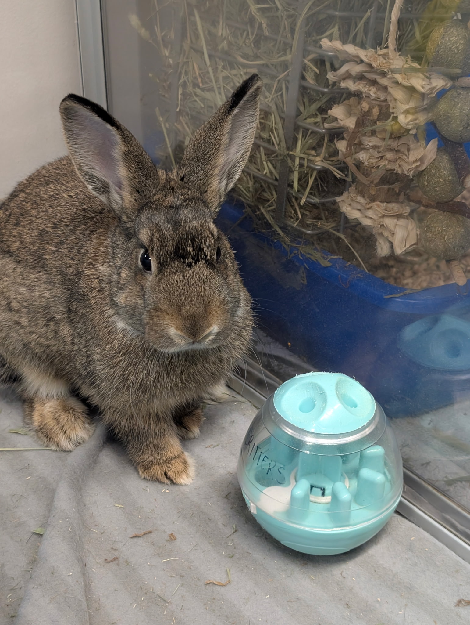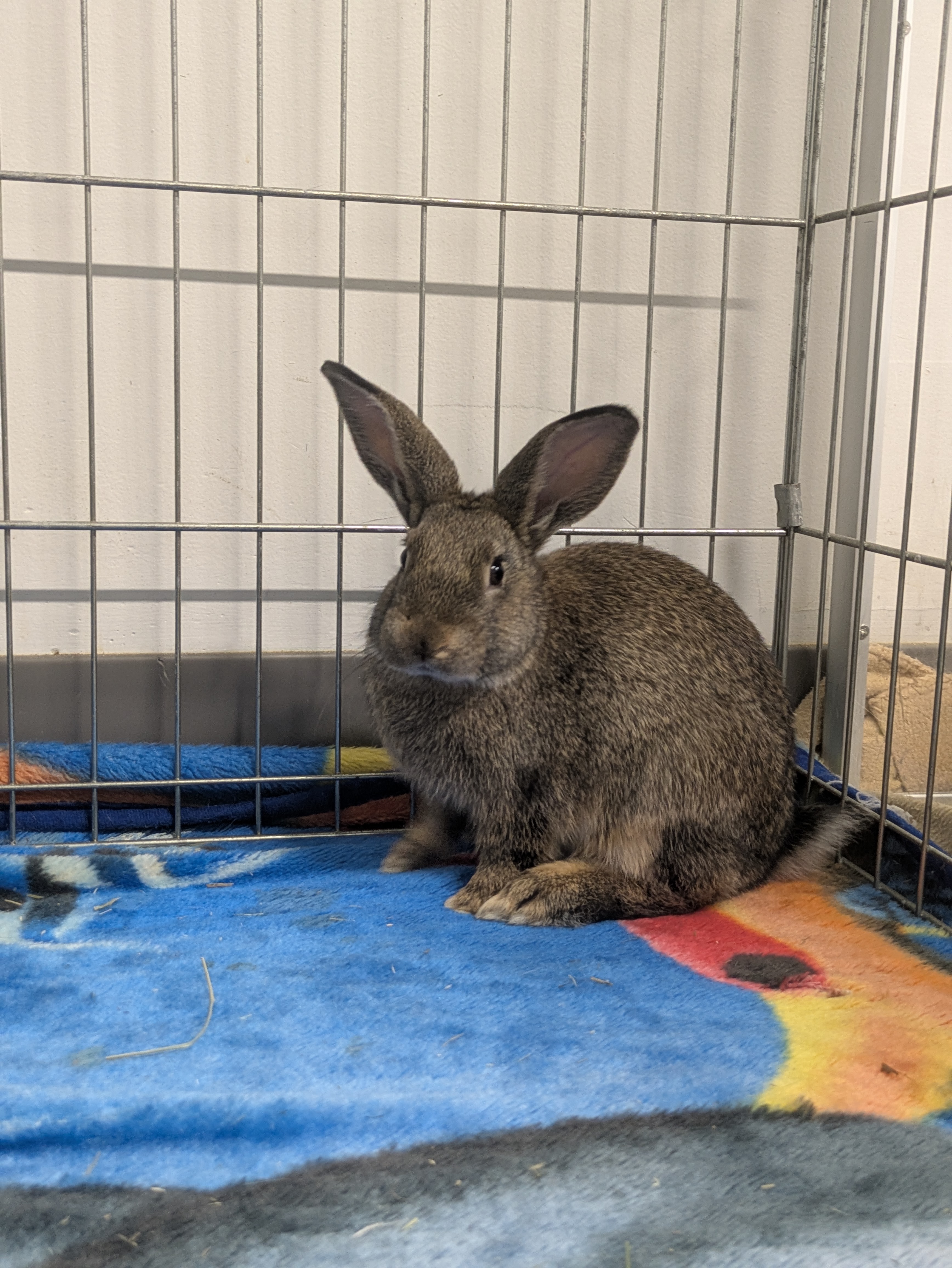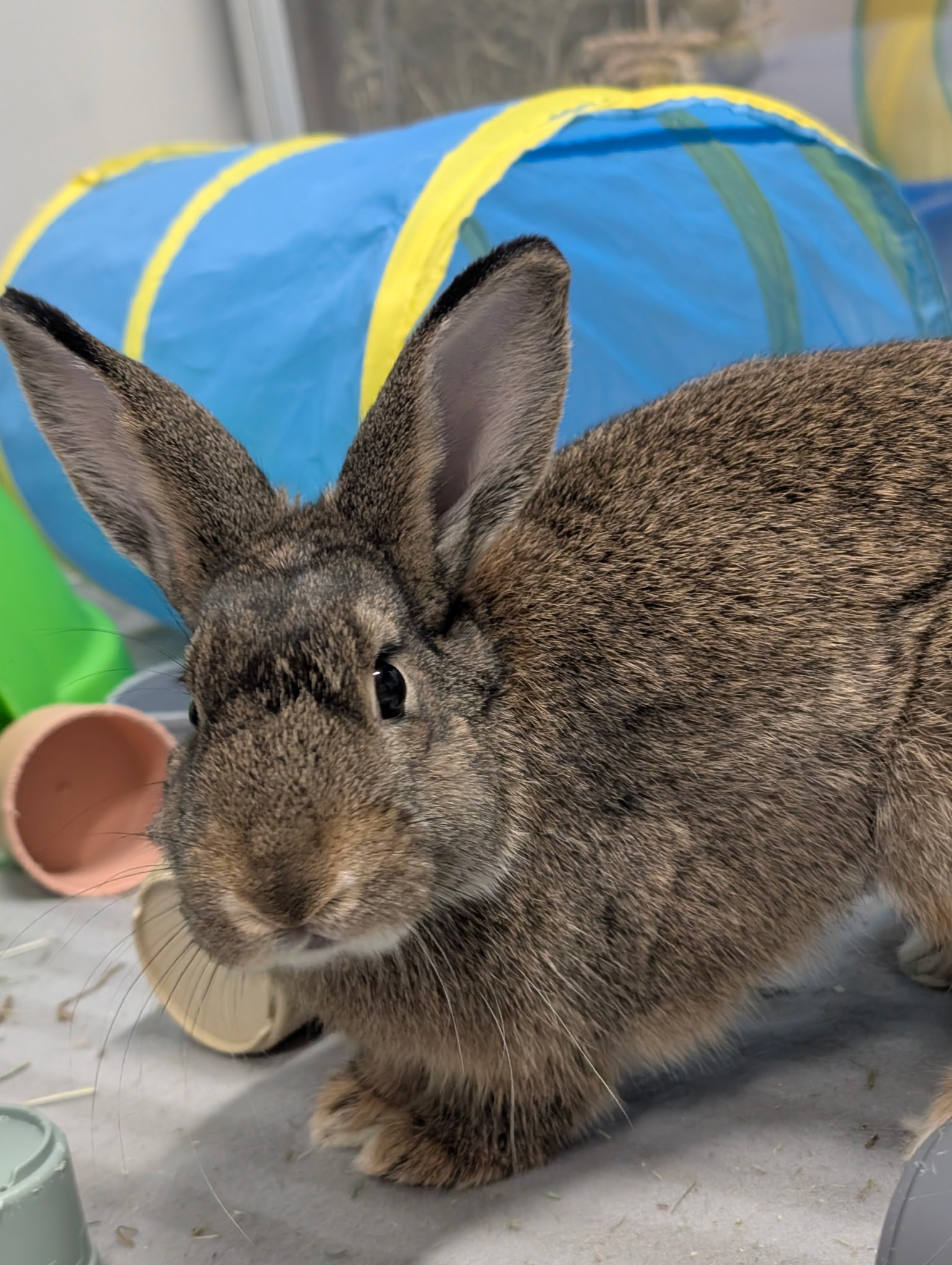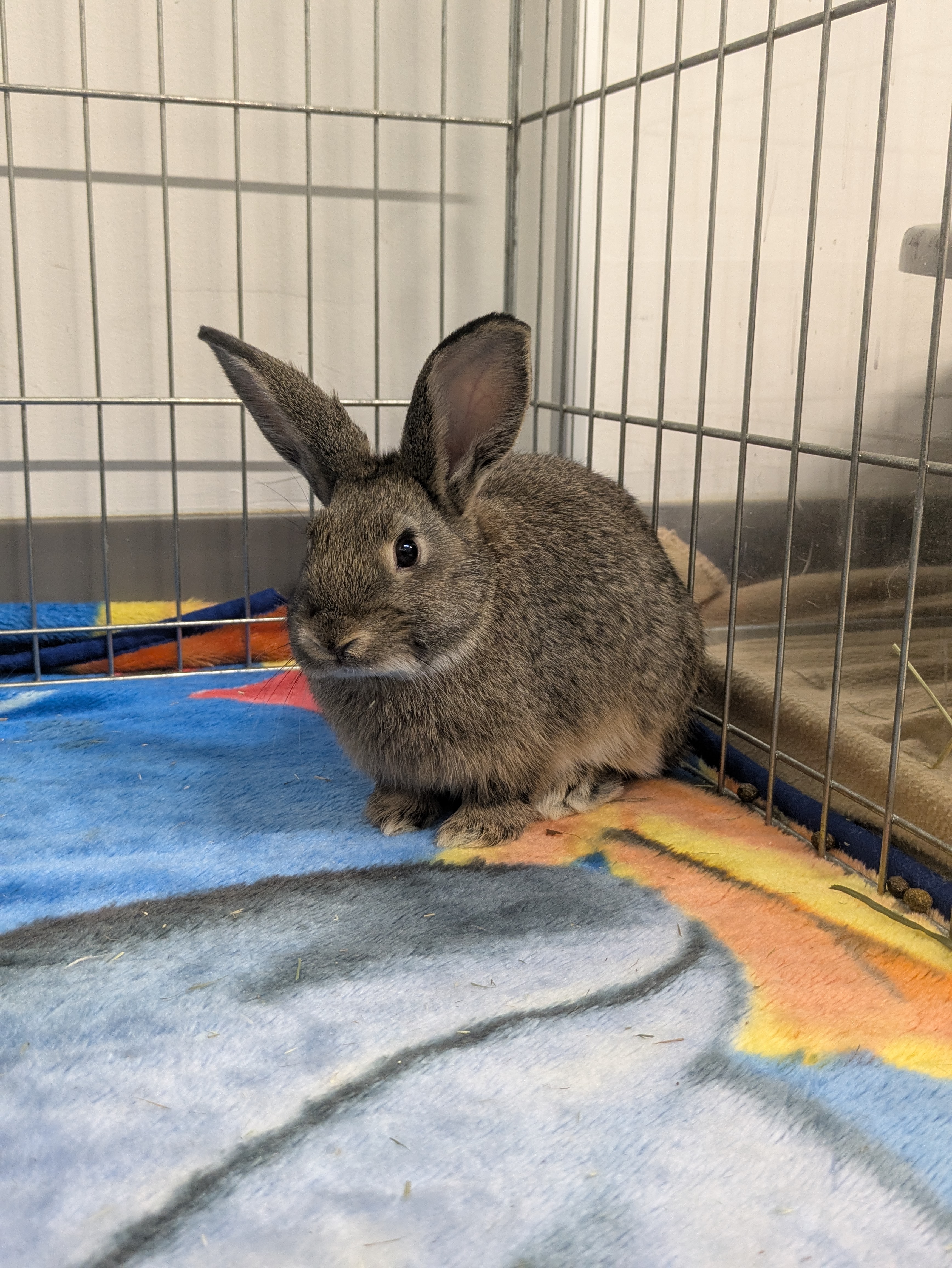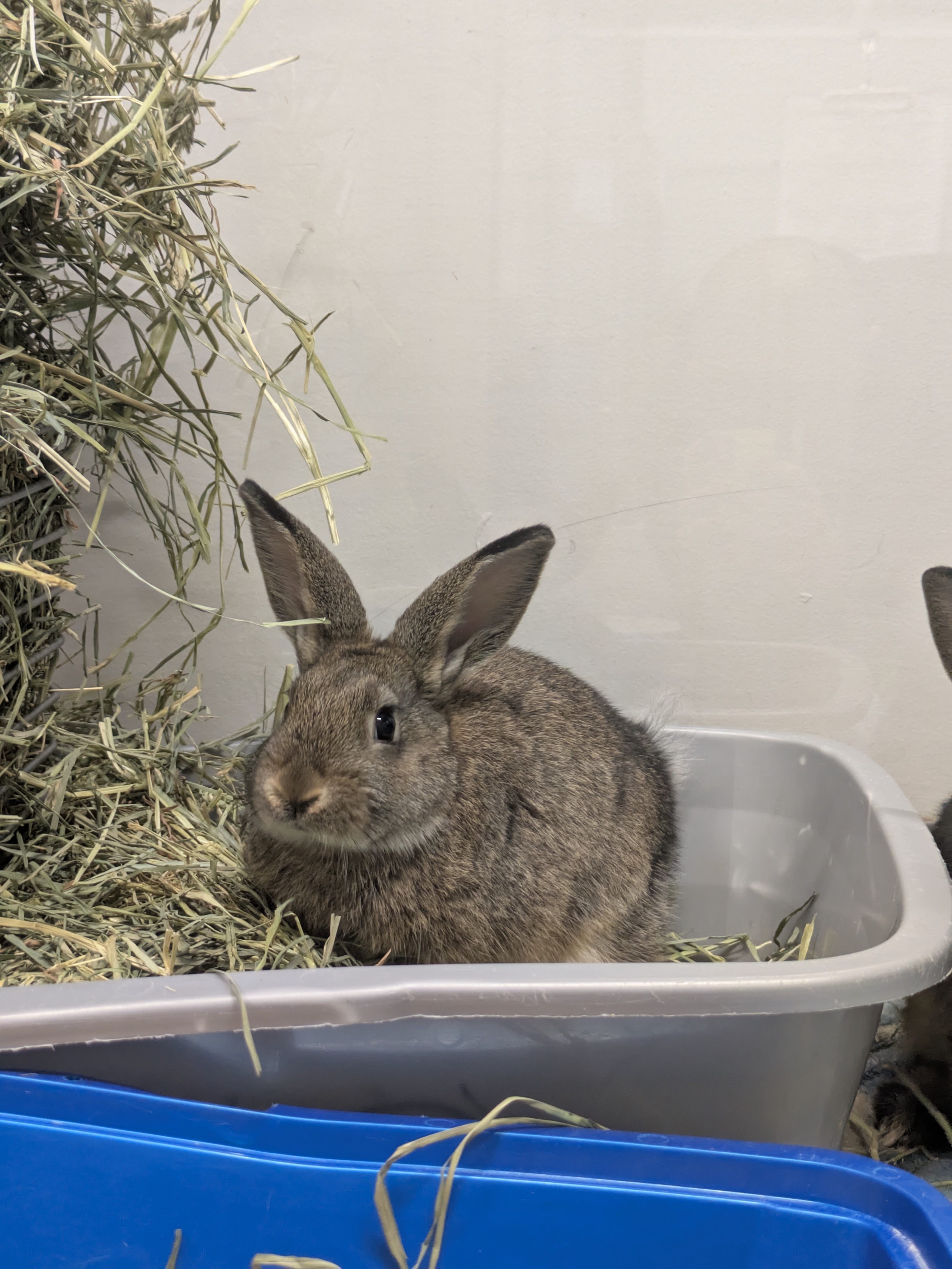 We do not adopt rabbits out to live in traditional cages. Instead, they need a spacious habitat (at least 12 square feet of uninterrupted floor space) and plenty of time outside of their enclosure each day to roam, stretch, and play. They also need toys, tunnels and hideouts for enrichment and comfort.