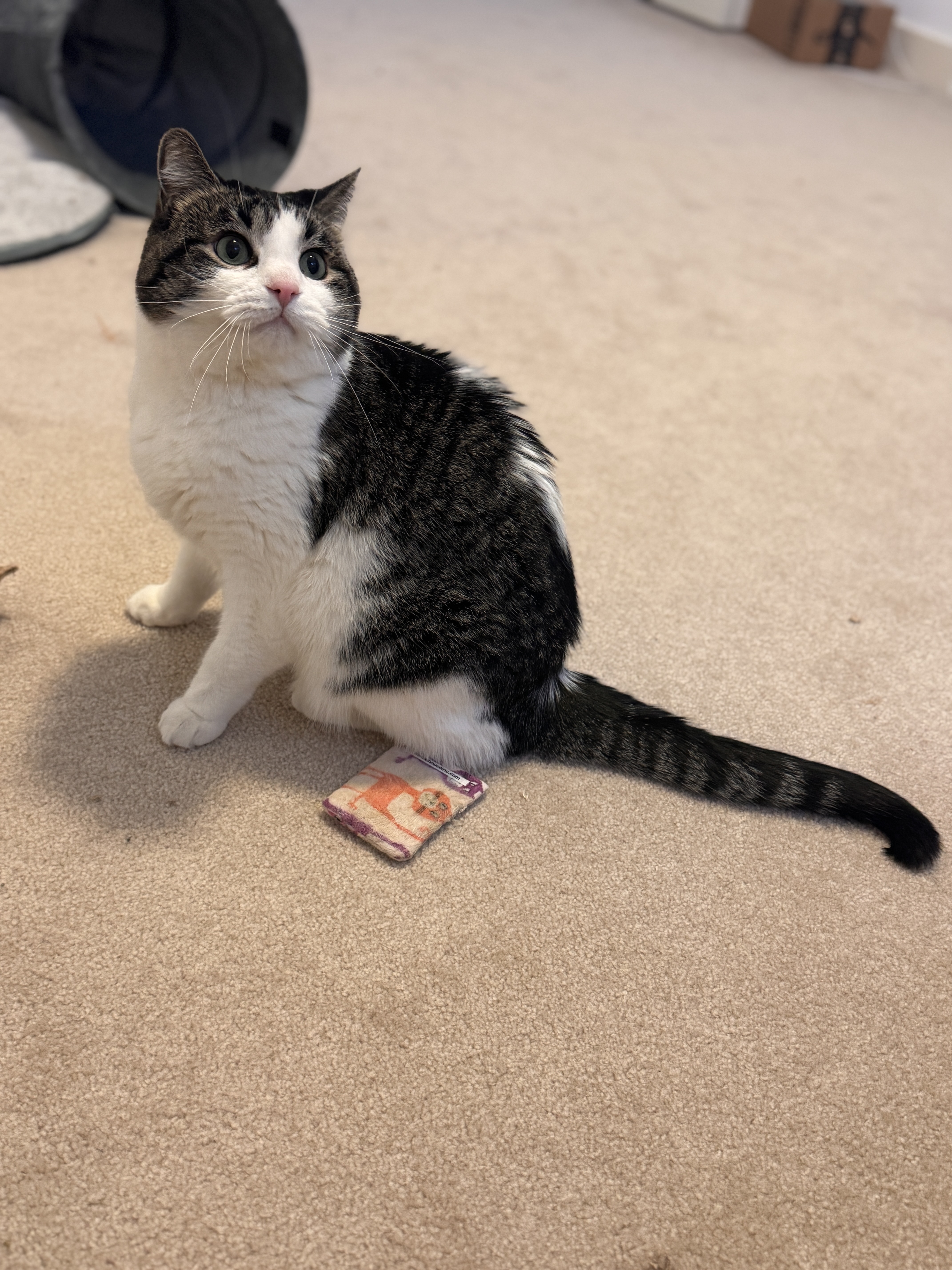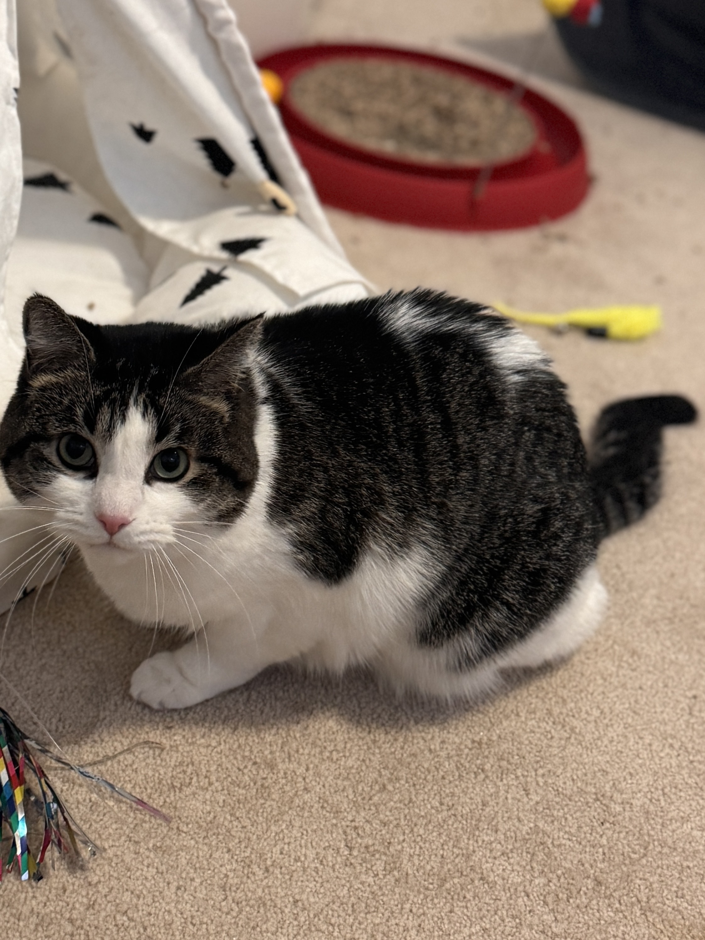 Hoxby loves to play and explore, showing off his curious and playful side once he’s comfortable. He does best in a calm, quiet home where sudden movements and loud noises won’t startle him. In return, he’ll be your loyal, affectionate companion—always nearby, keeping you company with his gentle presence.