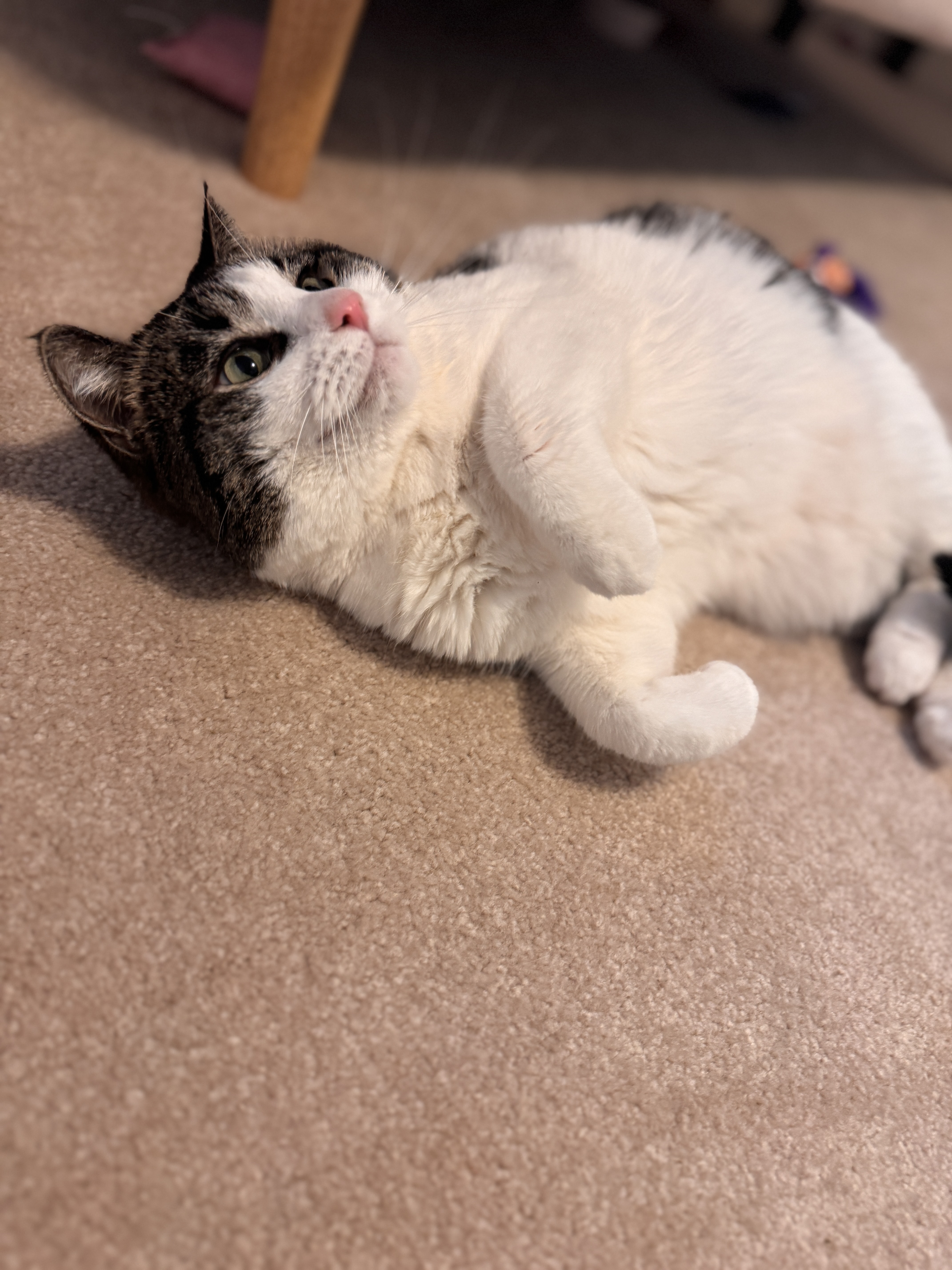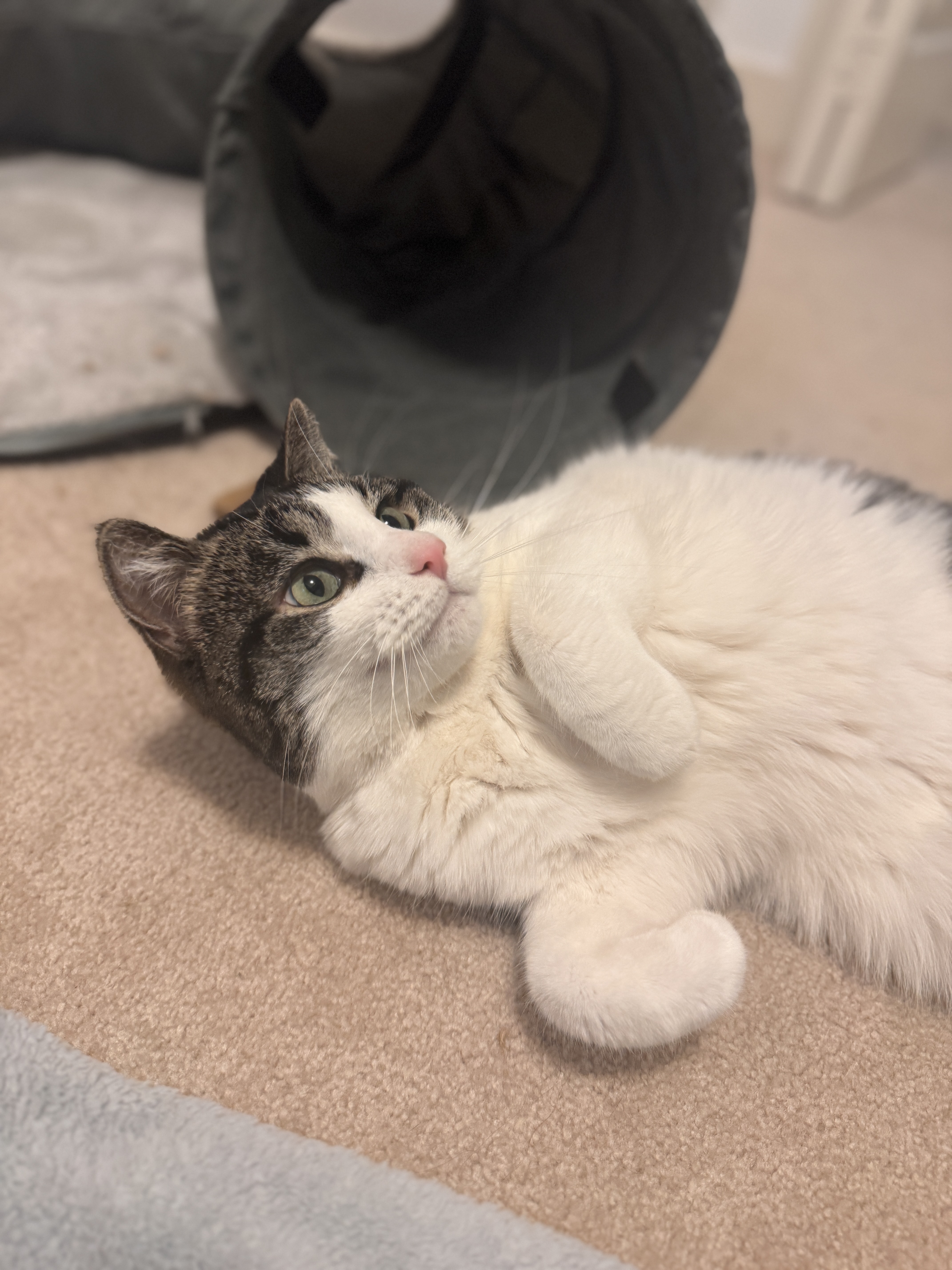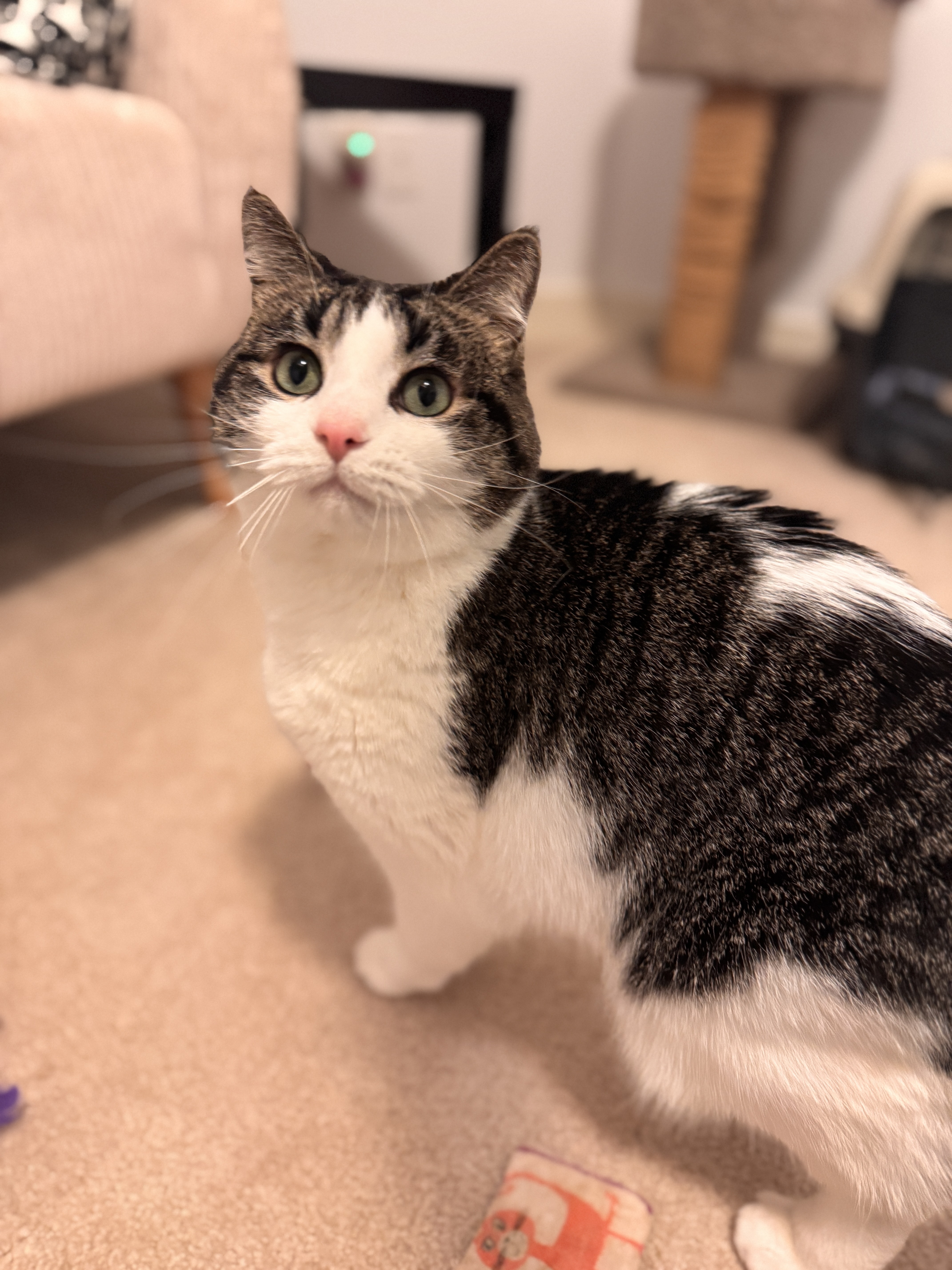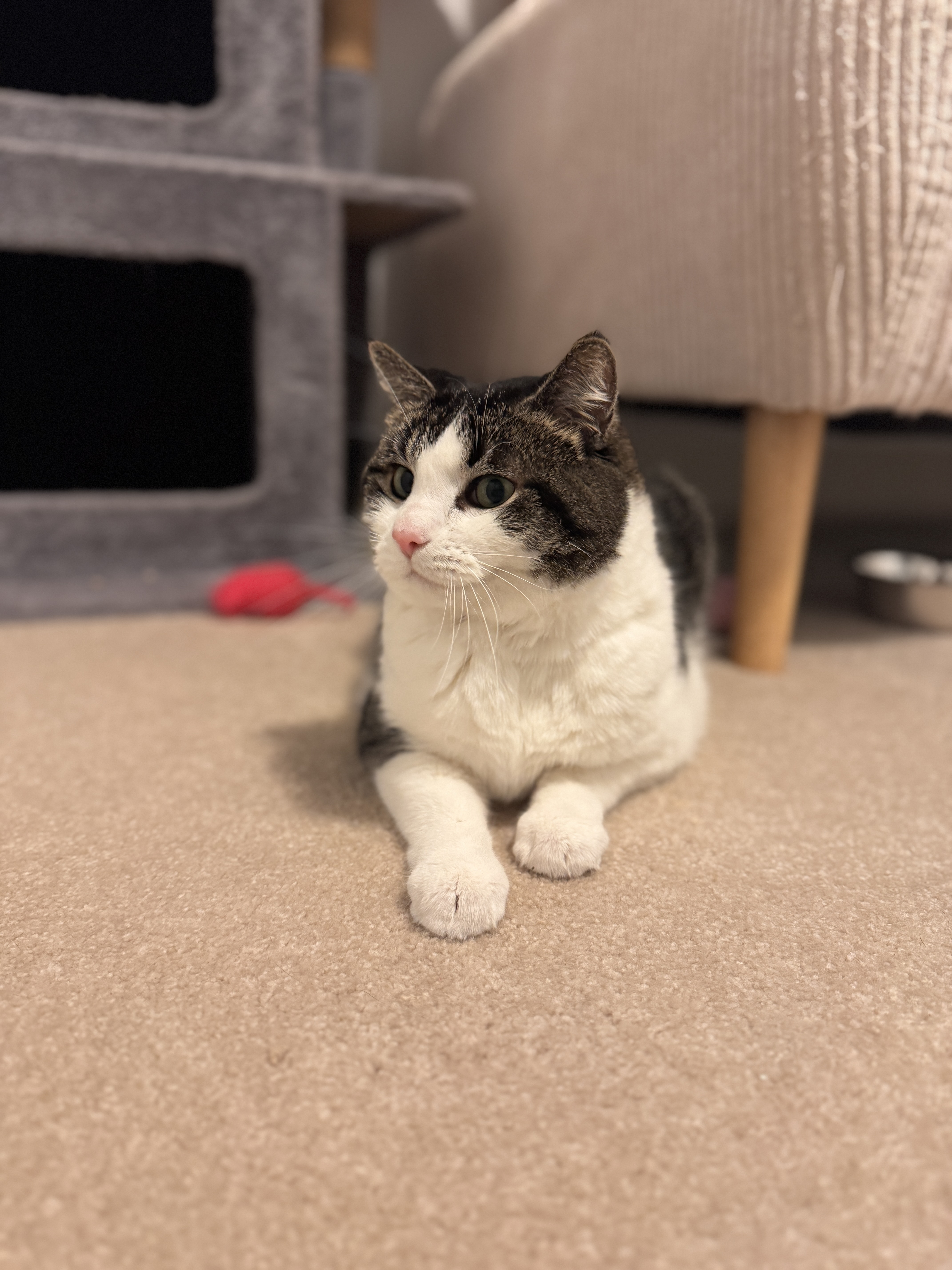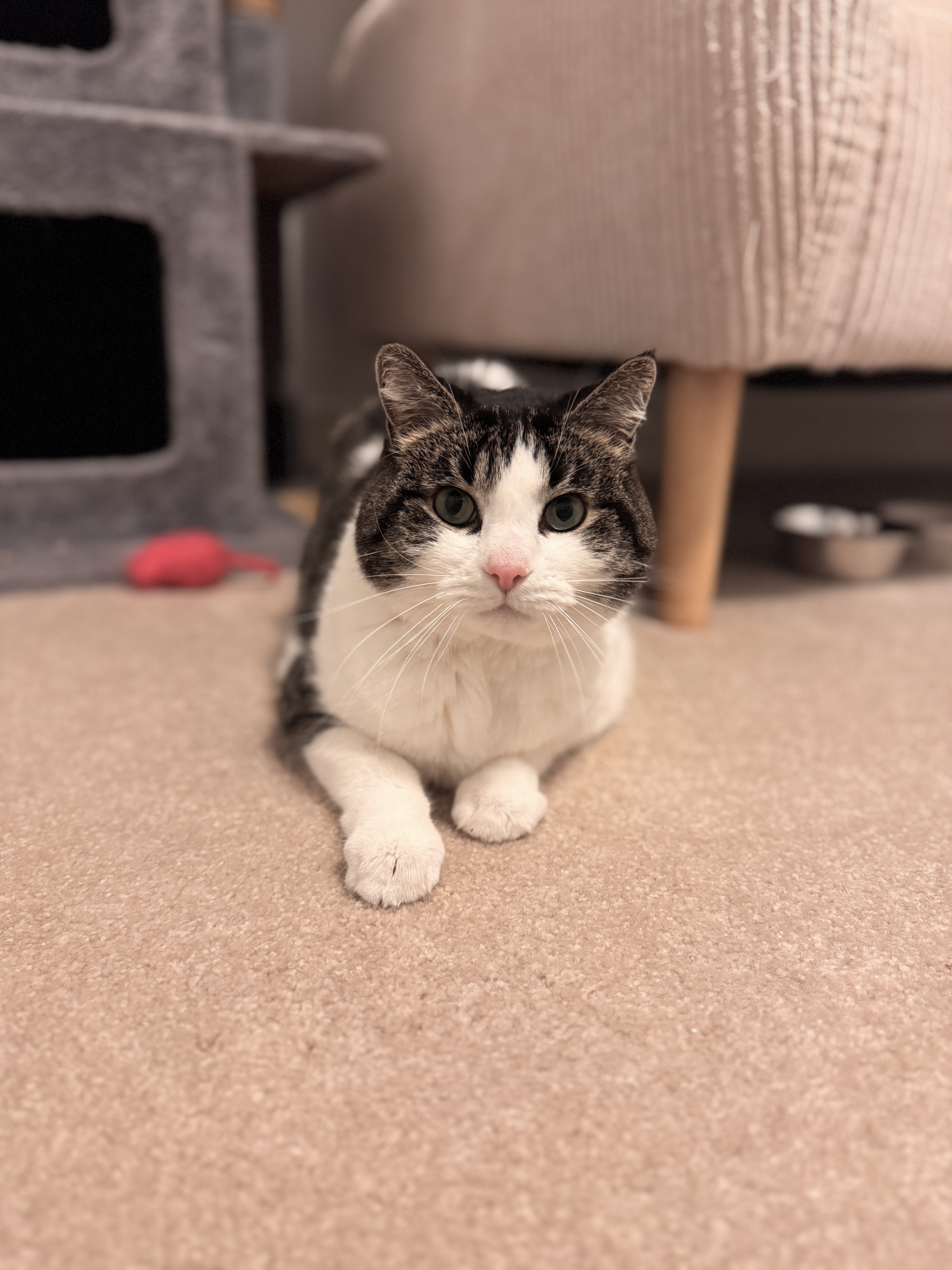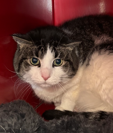 With his bright pink nose and striking green eyes, Hoxby will capture your heart the moment you meet him. He can be a bit shy at first and might let out a hiss to let you know he needs some space—but once he feels safe, his sweet personality shines through. Soon, you’ll find him rubbing up against you, purring softly, and greeting you with the happiest little chirps.