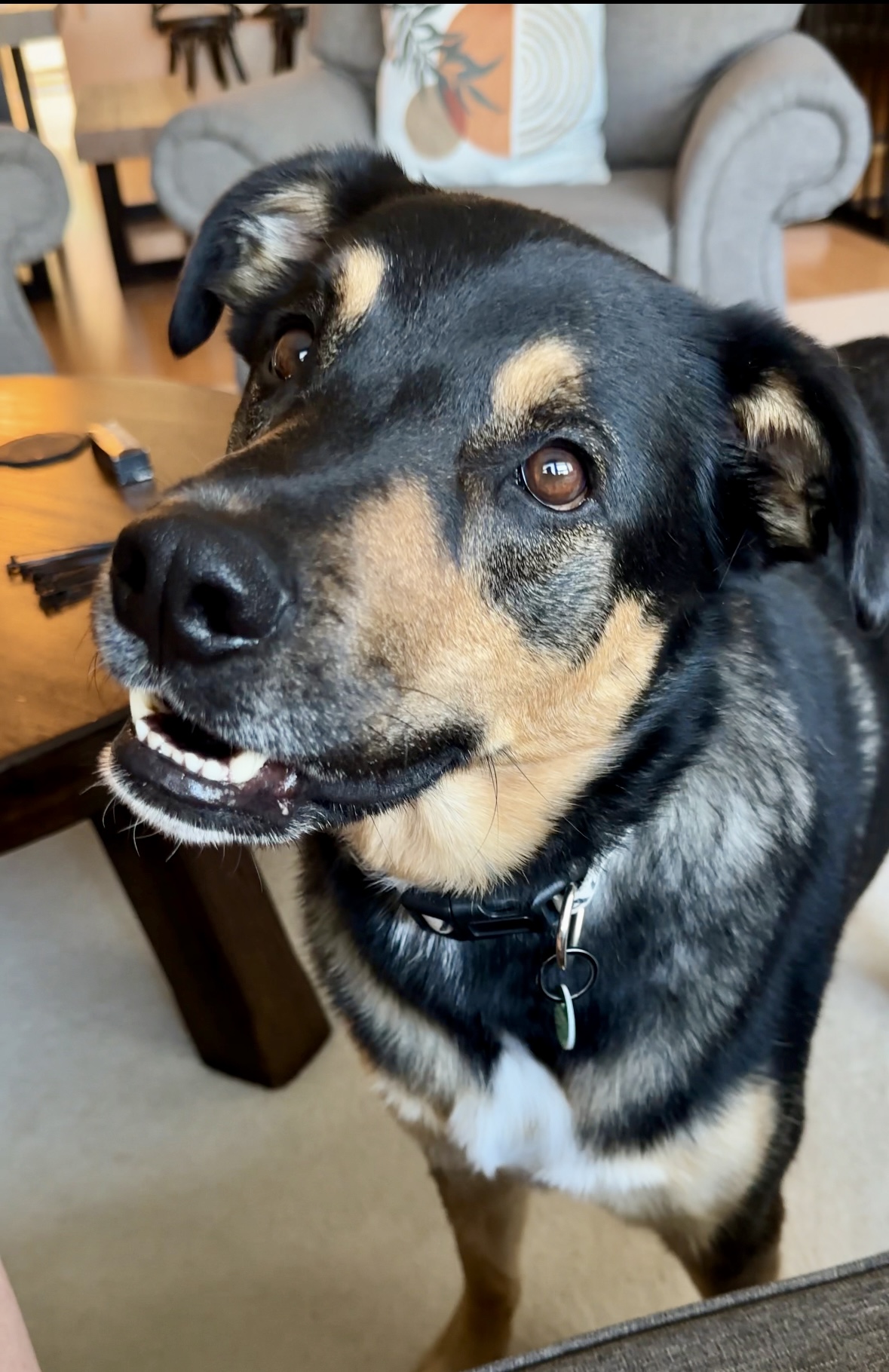 When it comes to meeting new people, Pecorino likes to take things slow. Out on walks, he’s easygoing—happy to pass by politely or pause for a quick sniff if given the choice. In the home, though, unexpected guests can make him nervous. With help from a trainer, he’s learning that visitors = treats and calm vibes, and his confidence continues to grow. Meeting people outside first or entering together helps a lot, but he’ll do best in a home without constant comings and goings.