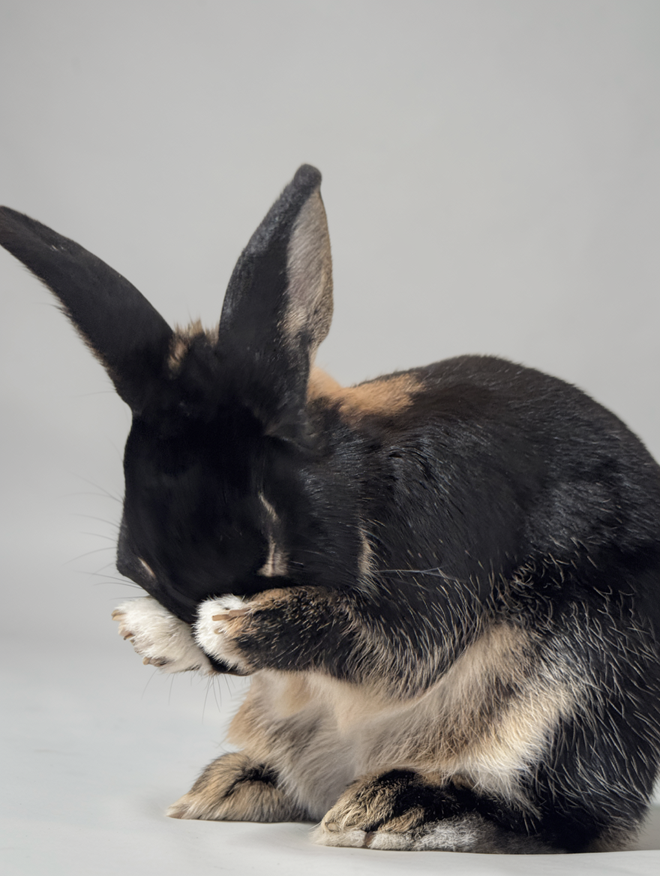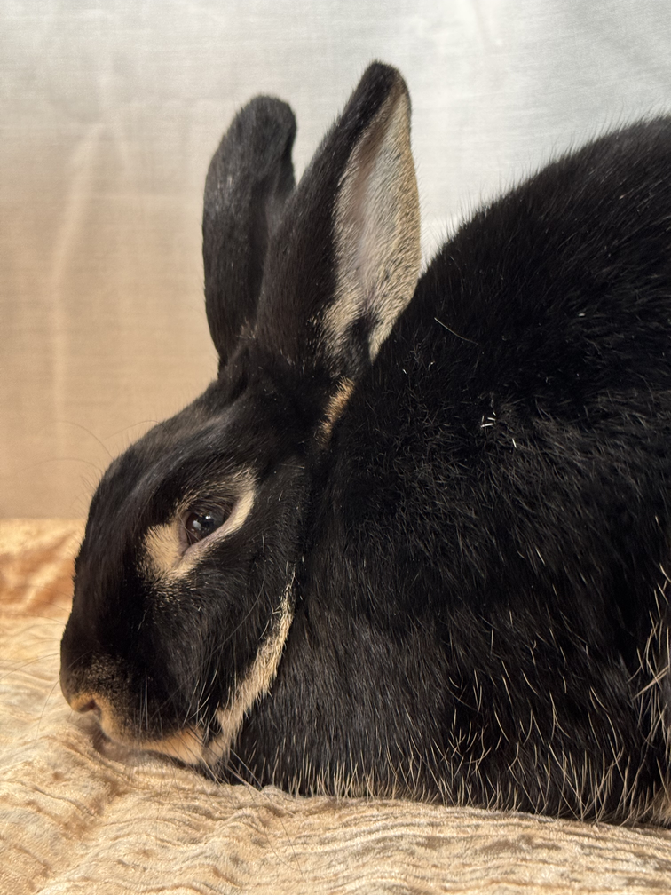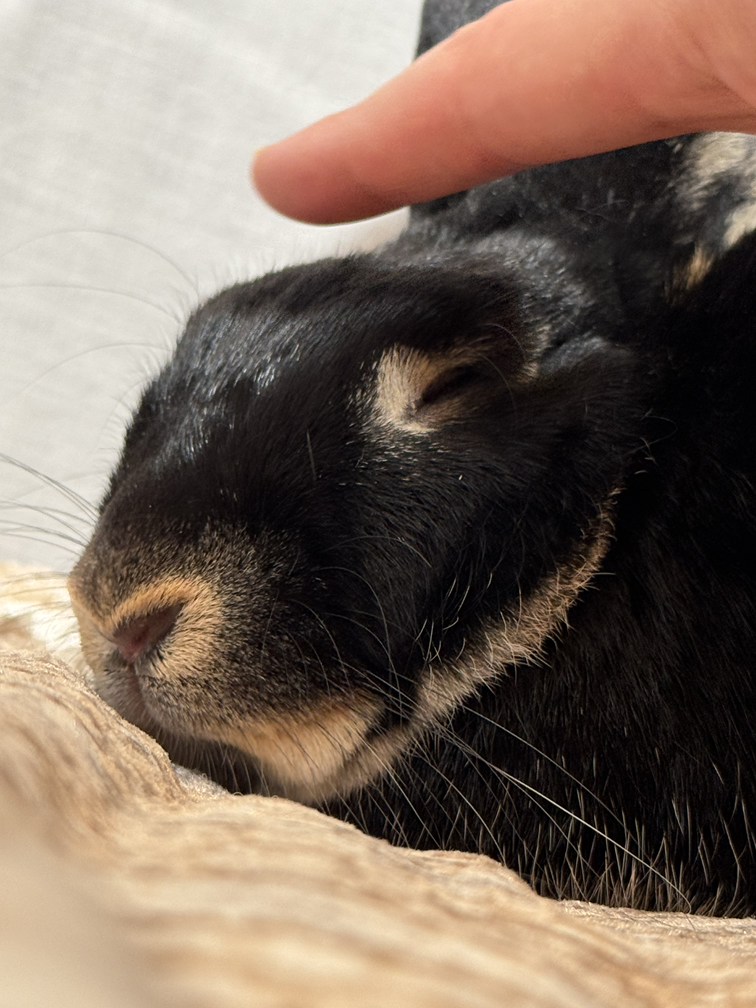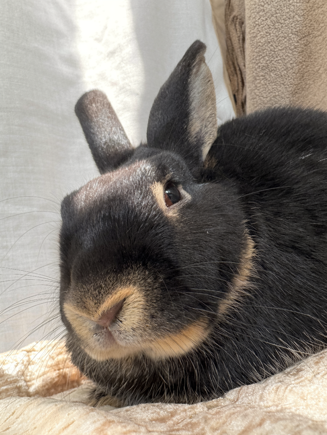 Ella loves to take treats from her trusted loving human and will accept head scratches. Banana, cilantro, kale, broccoli, romaine lettuce and a mix of timothy/alfalfa/orchard hay are some of her favorites. She has not yet acquired a taste for mint. Ella is a curious, quiet and friendly rabbit.
