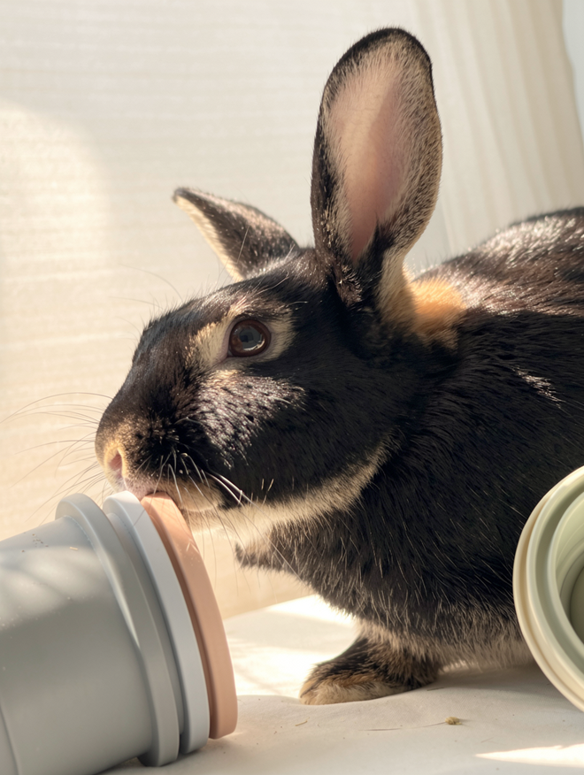 Ella is an excellent listener and is ready to keep you company when you are reading, streaming, studying, working out, cleaning or just enjoying the day. She loves to binky about her room, run through tunnels. hide under boxes and chairs and enjoys hopping up onto chairs for a better view too. Nestling in soft blankets and under hay is also something Ella enjoys. When she is provided with proper enrichment like treat/food tumblers, balls, cardboard, apple/willow branches and enough room to exercise she is quite content to leave her blankets, towels and carpet alone to rest upon. When she has binkied herself tired she will flop on her side and chill.