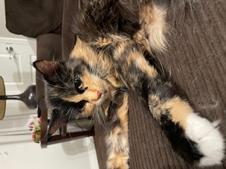 I’m a gorgeous black, orange, and white kitty with long, elegant legs, a fluffy coat, and the most adorable face — I even come with my own built-in accessories: a cute little “mask” and a tiny goatee under my chin. It’s my signature look, and I wear it proudly.