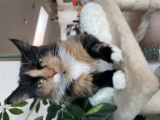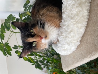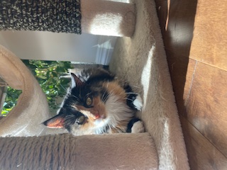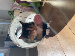 I’m a mix of playful energy and pure affection. I love to chase and fling my catnip fish through the air, zoom through my cat tunnel, and race around the house when I get the zoomies. When I’m not in play mode, I’m all about the cuddles — belly rubs, face pets, and chin scratches are my love language. My purr is loud enough to make you smile, and my cute, coyote-like meows will definitely get your attention.