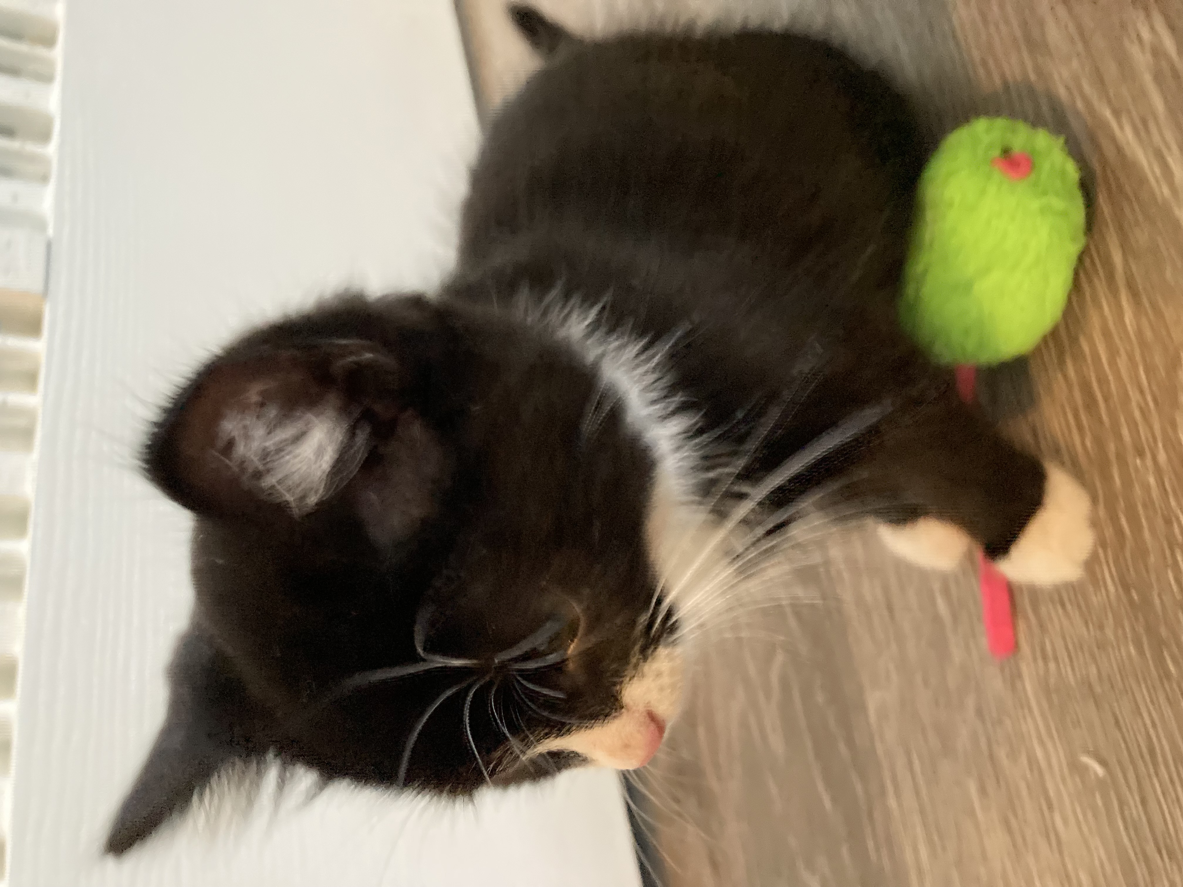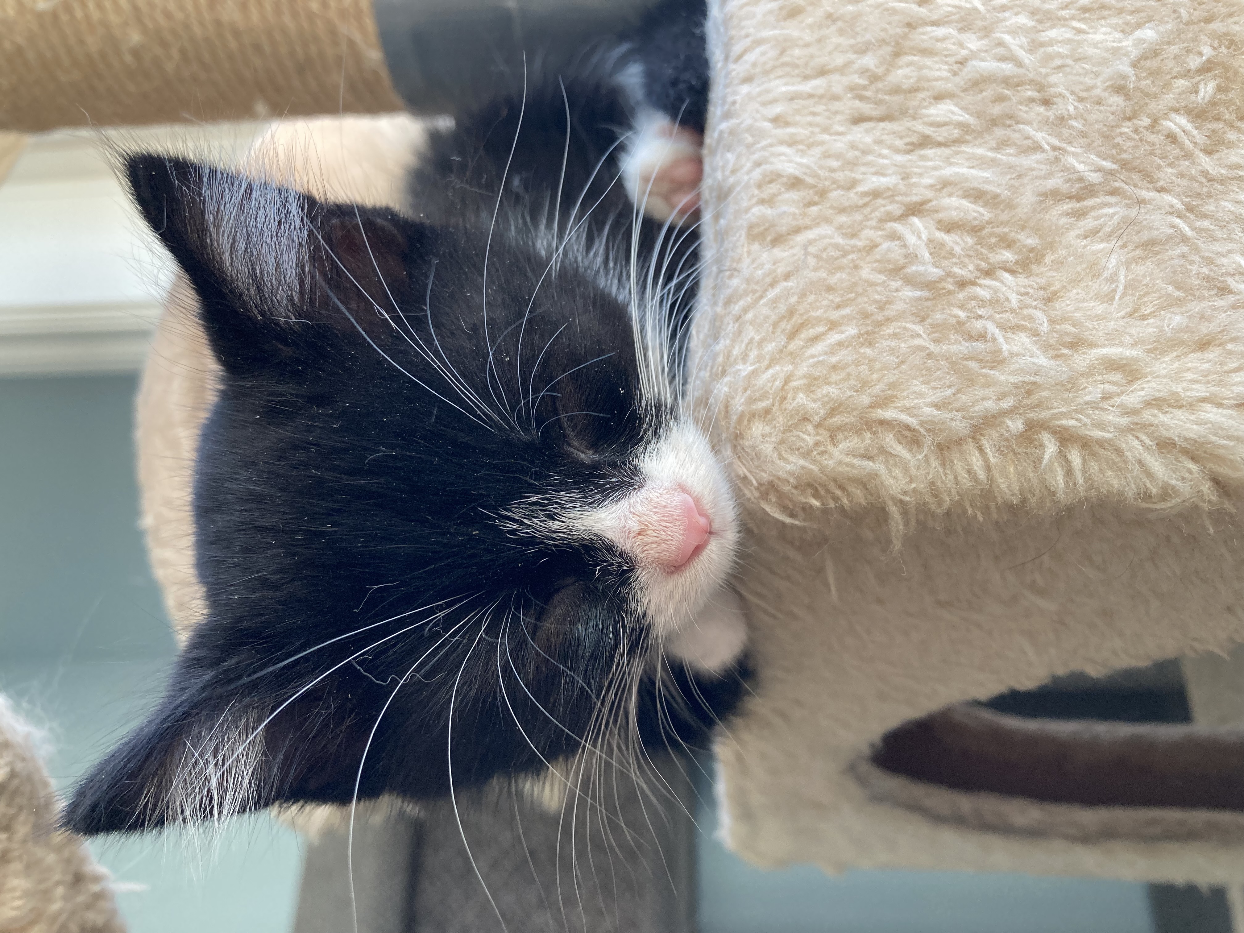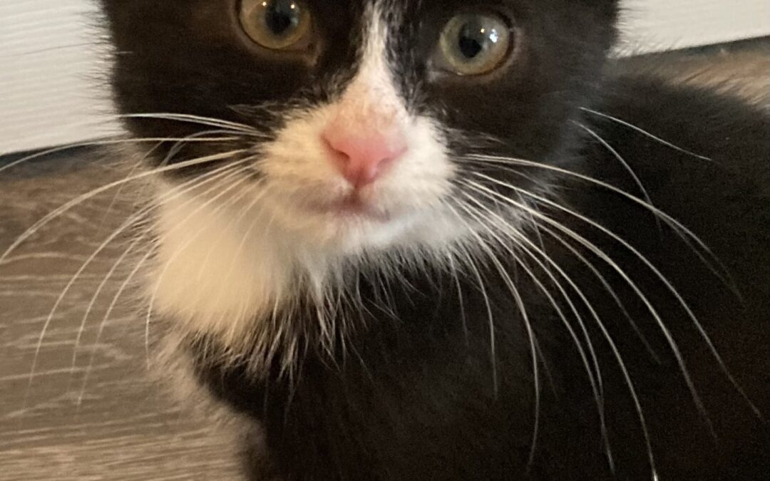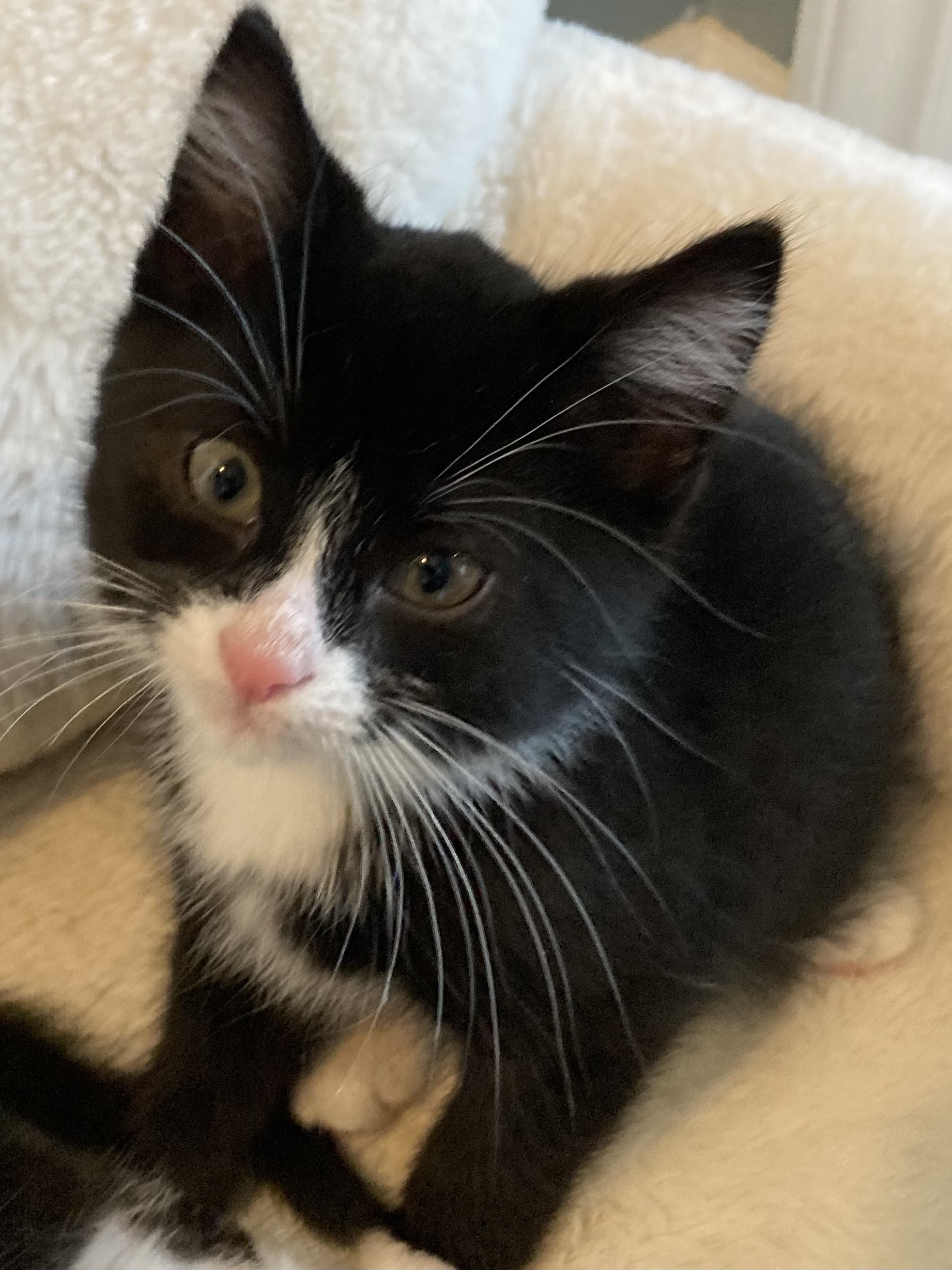 Owen is a chubby-cheeked and bright-eyed tuxedo kitten with a laid-back attitude. He enjoys playing with toys and having a romp with his siblings before curling up for a good lap cuddle or kitten puddle.