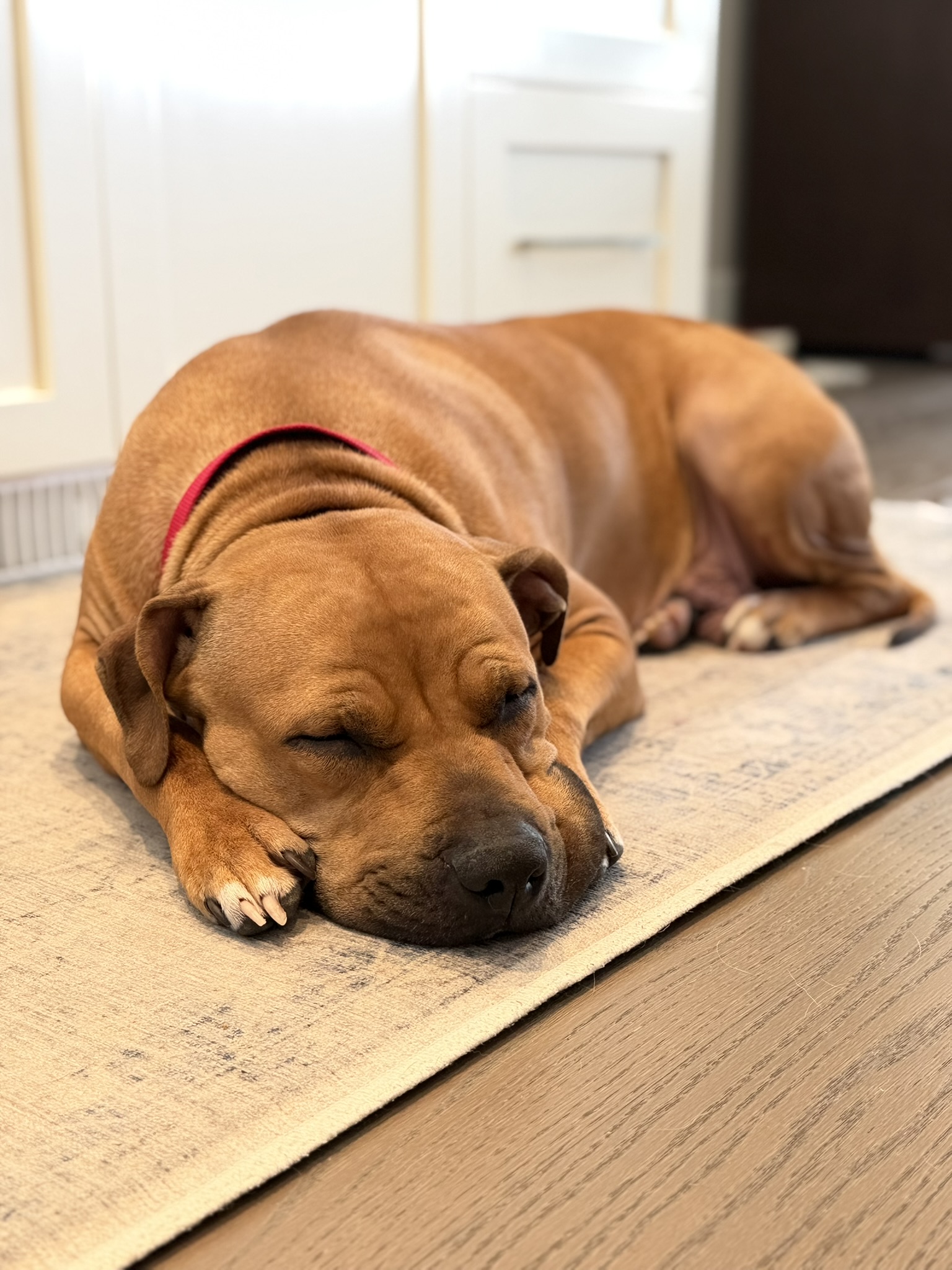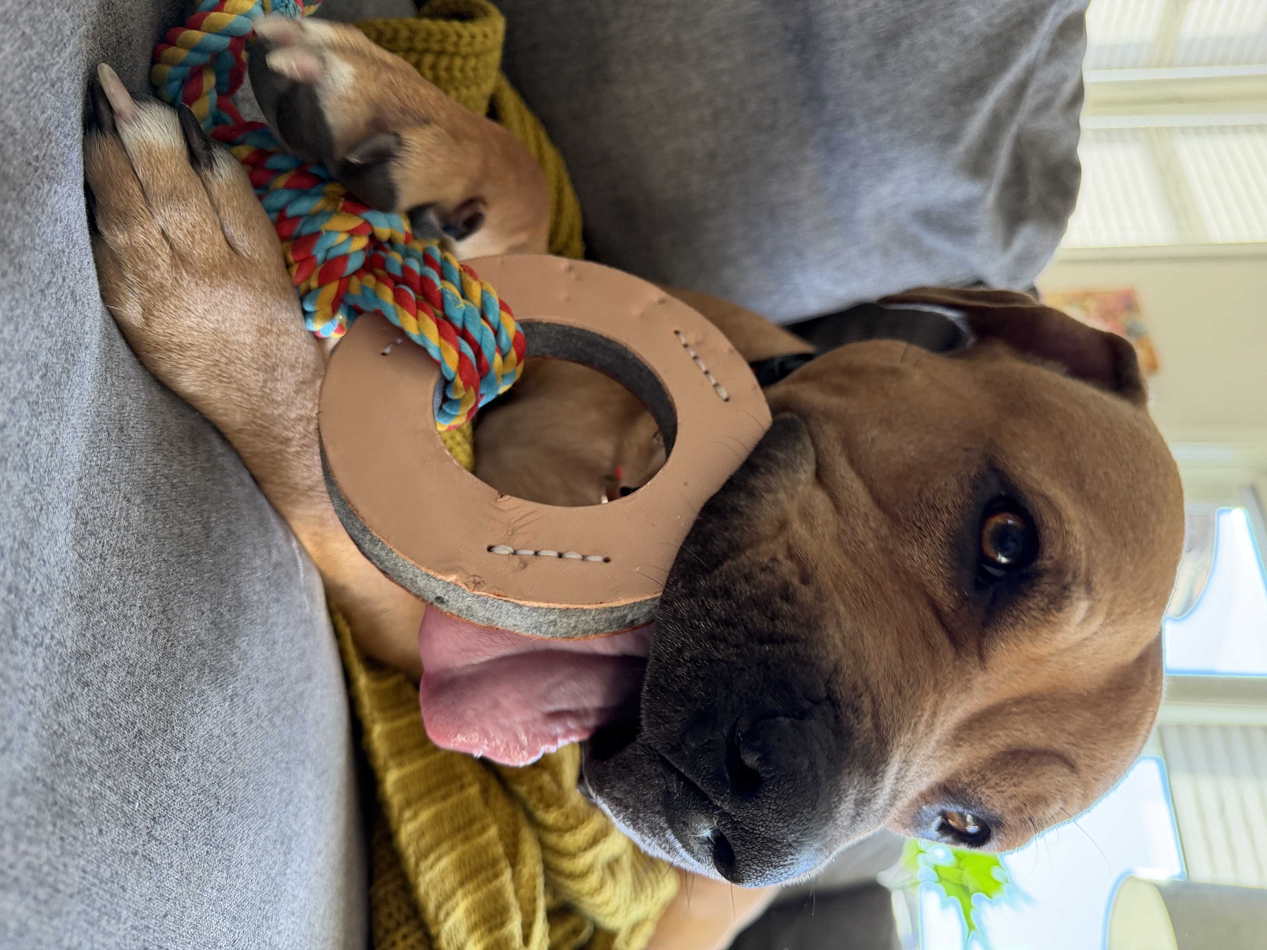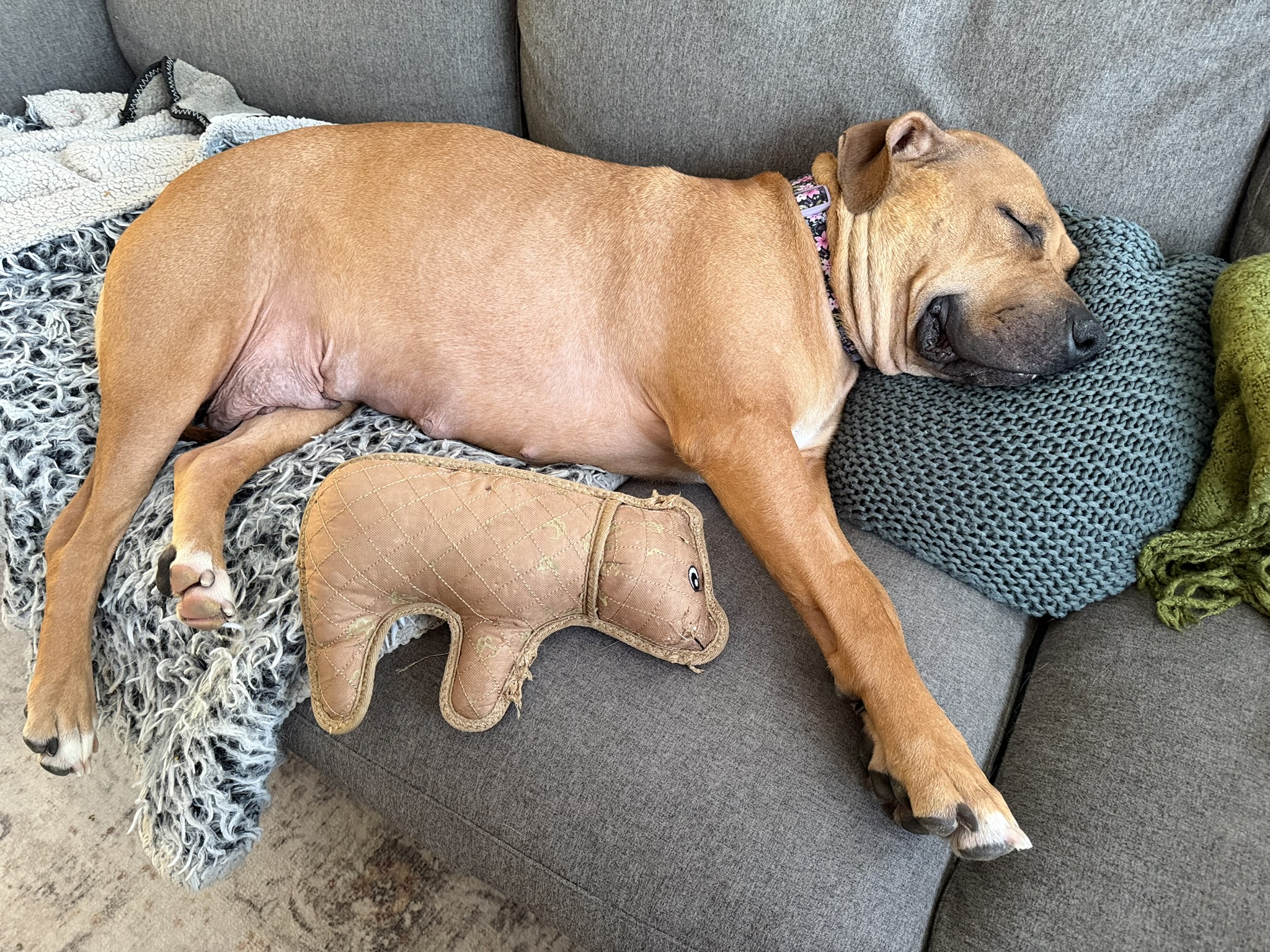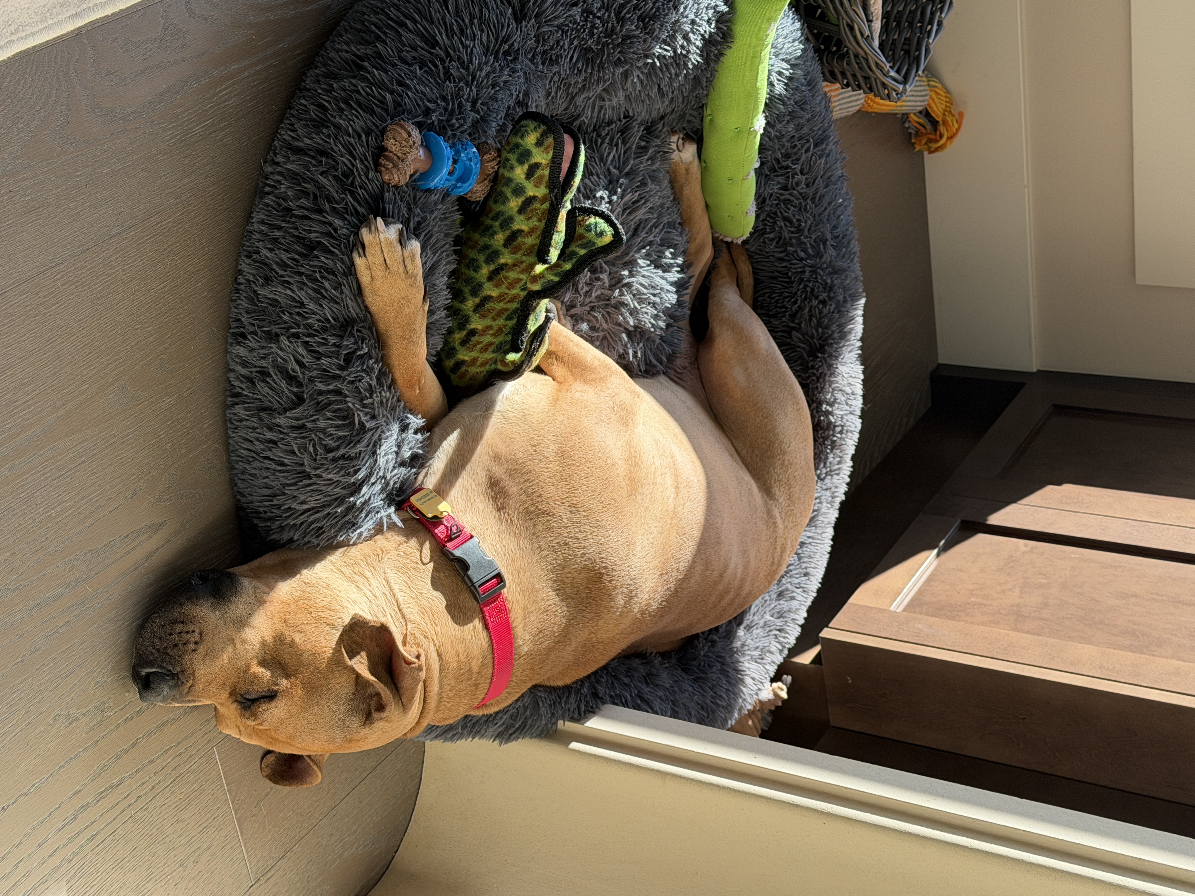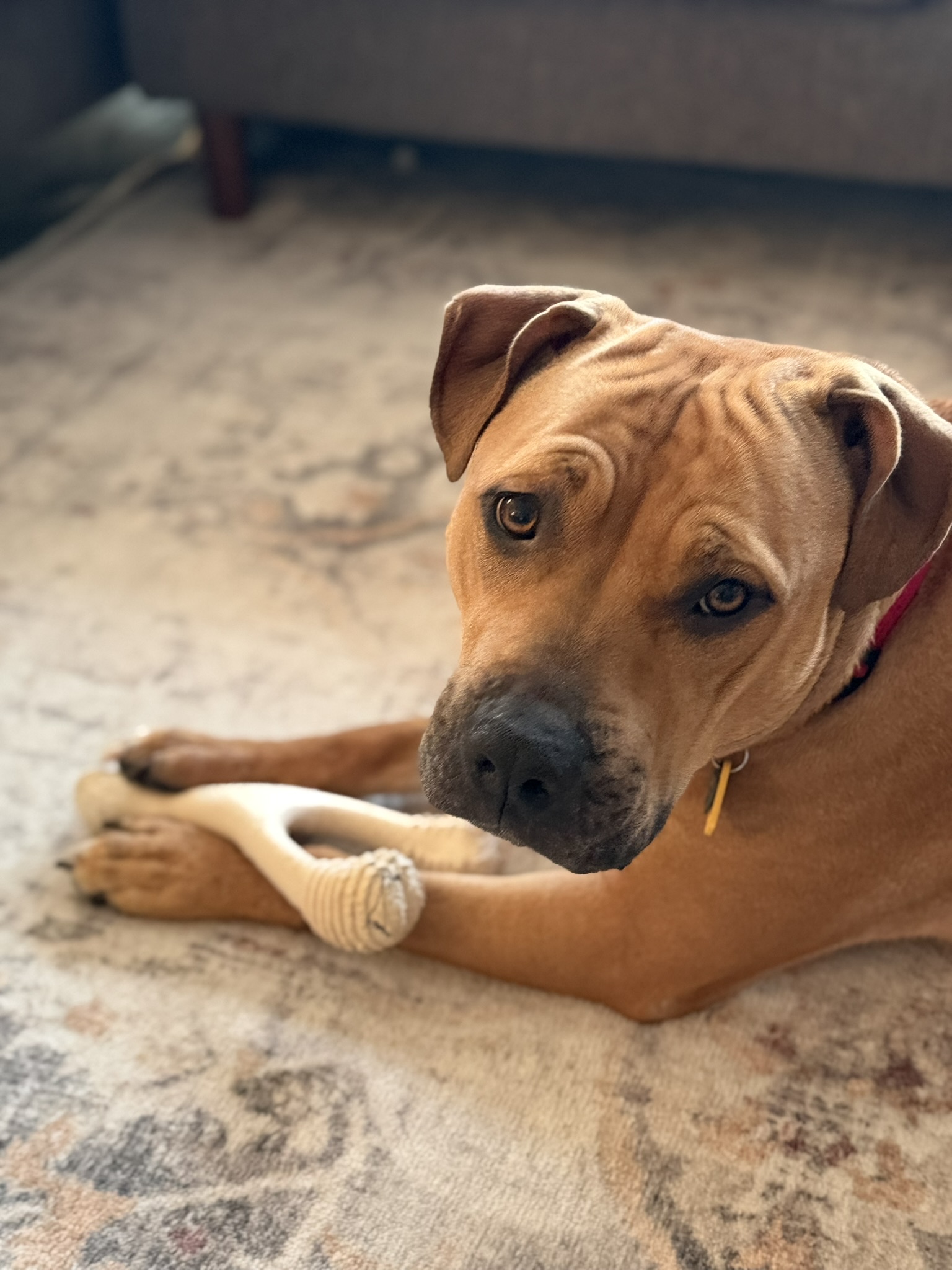 What are your favorite things to do? – “First, chewing, as I LOVE a hard toy – but let me clarify that I don’t chew anything that isn’t my own. I also love napping (who doesn’t) and slow sniff-walks to explore the world outside. I’m playful in bursts inside, but then I feel the warmth of the sunbeam, and I just must lay down for a rest and a snore.” 💤