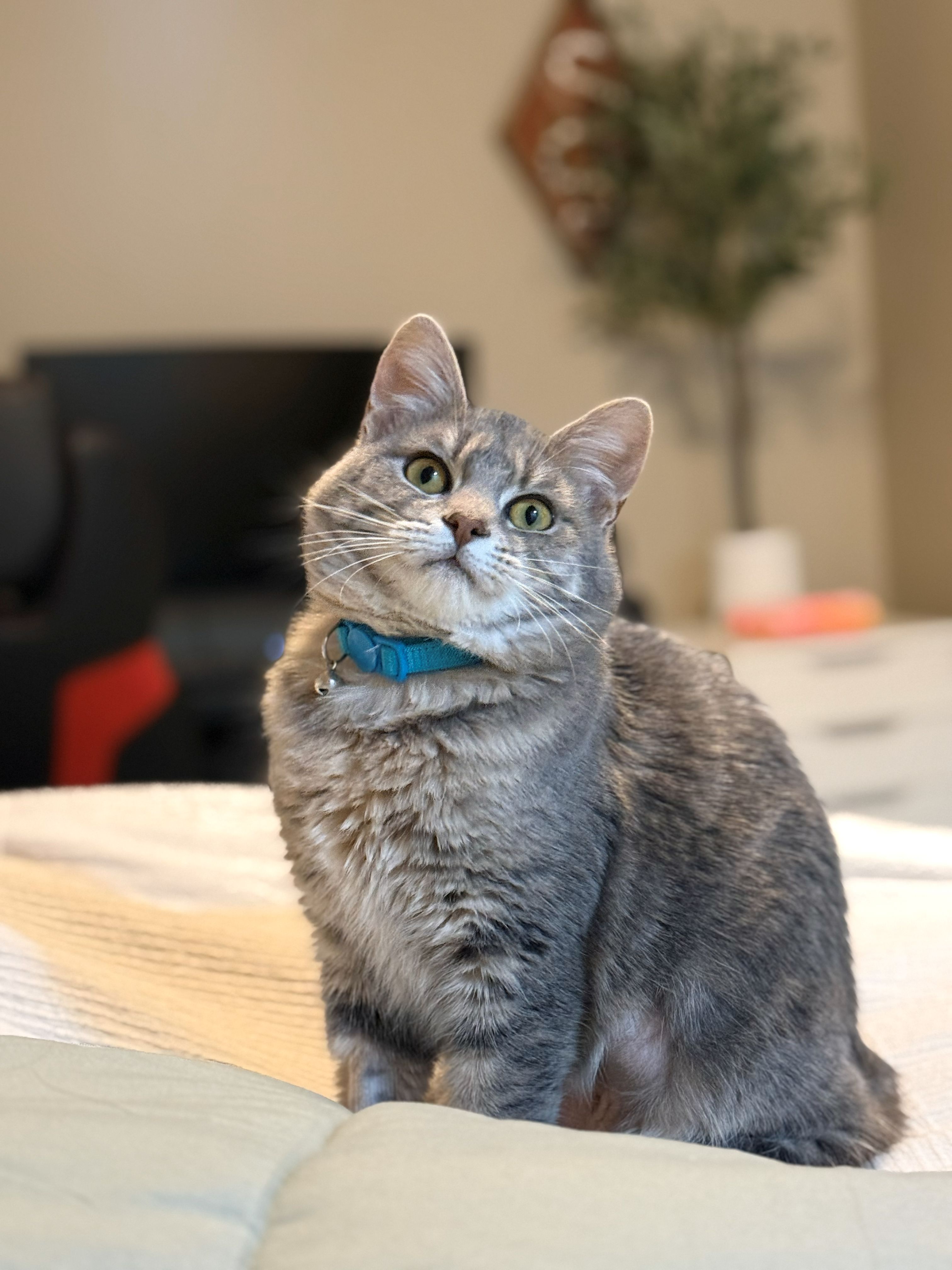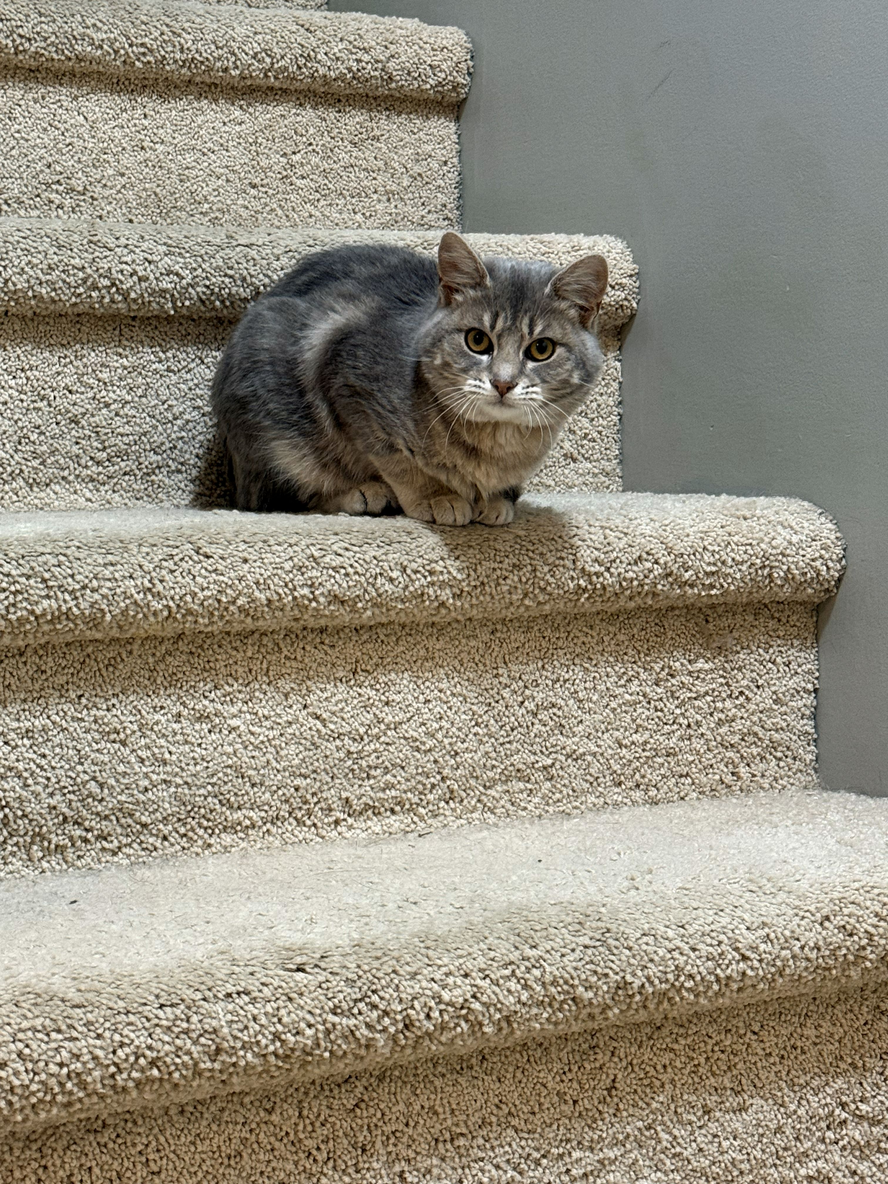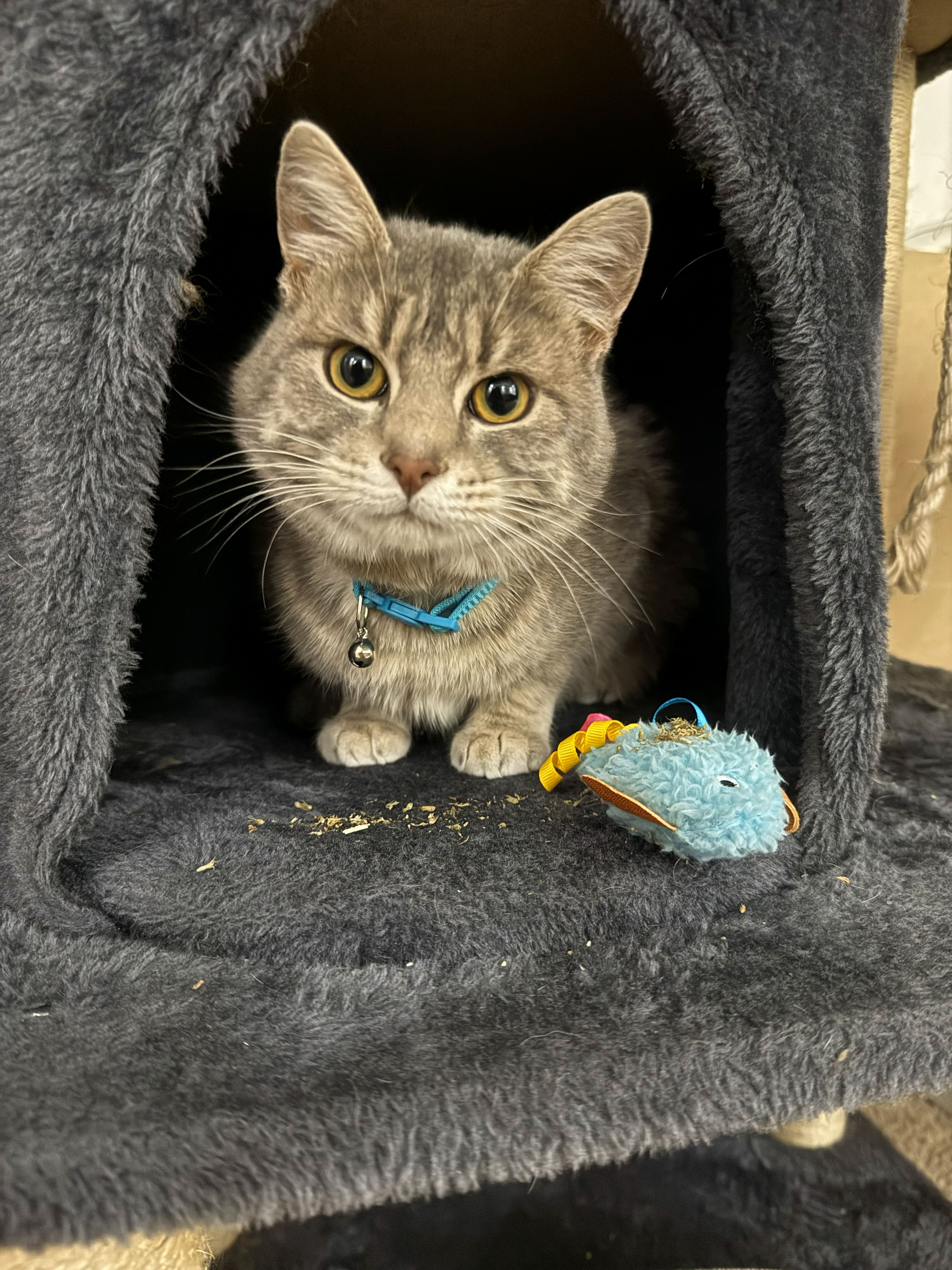 This sweet girl likes to take things at a slow and quiet pace, but with some space and patience, we have really got to know this cutie’s personality. She loves to play both on her own and with people. She’s not a fan of being picked up/held, but loves accepting pets and chin scratches in her safe space (currently a cat tree cubby). With time, I can see her being more open to affection (she has even snuck into bed with me a few times after I have fallen asleep.)
