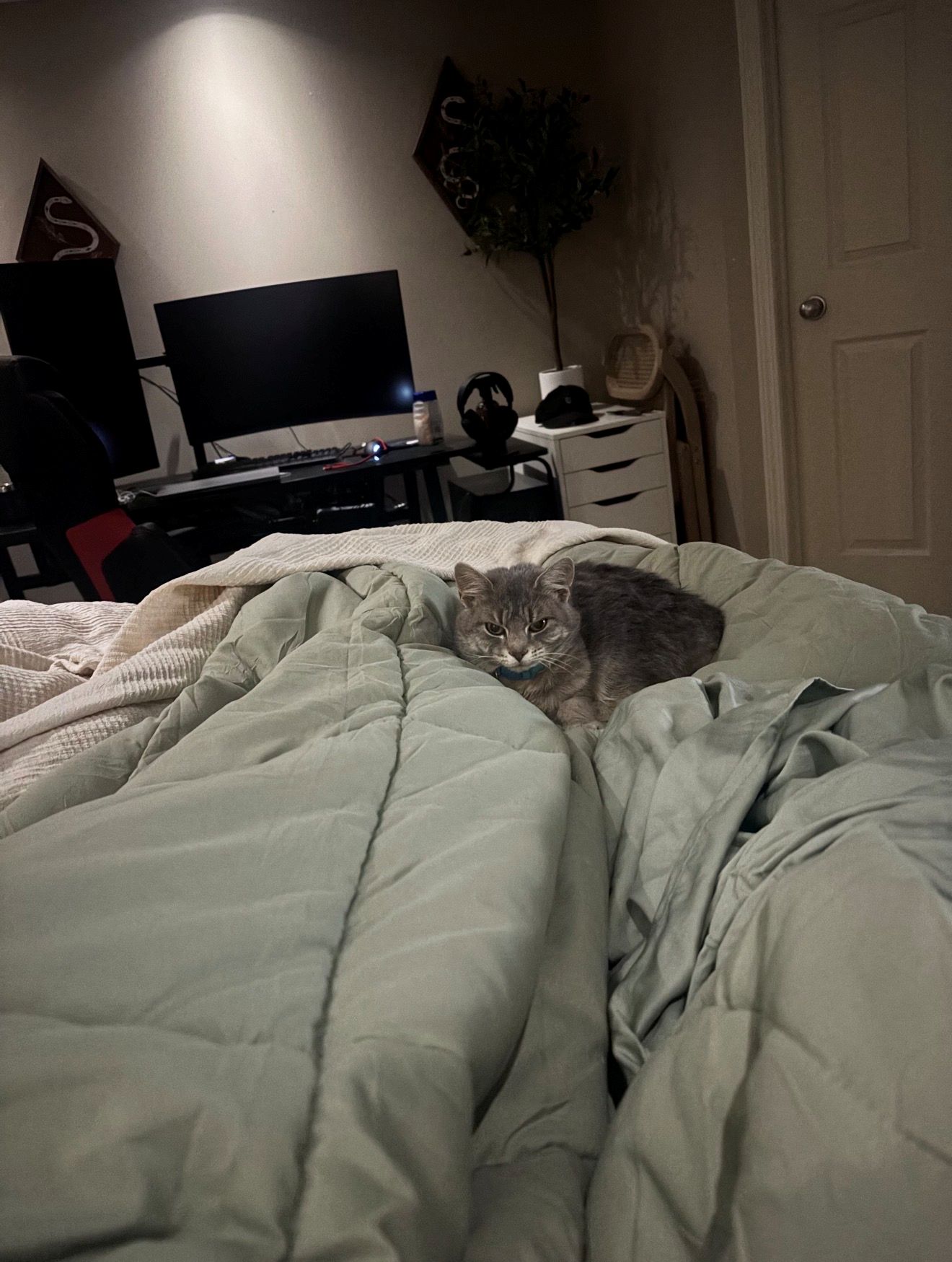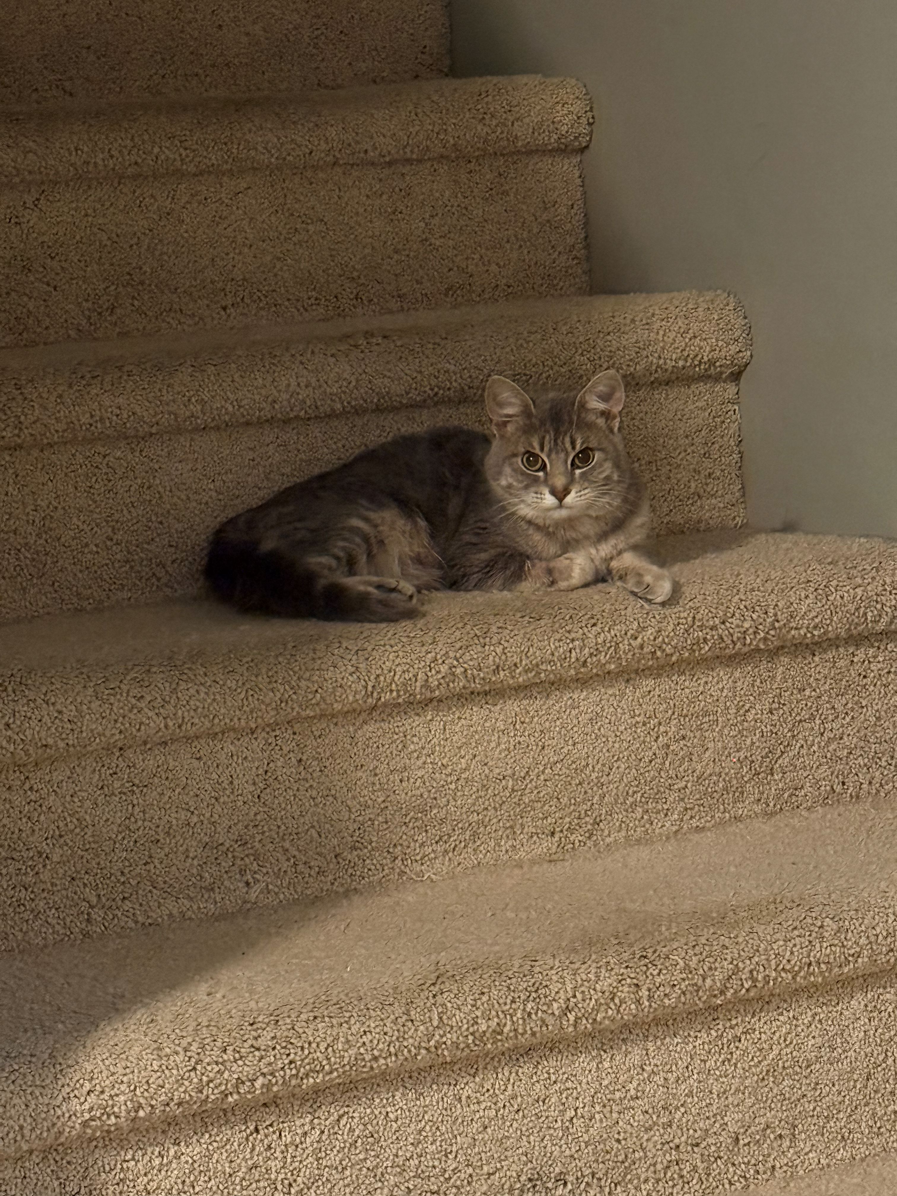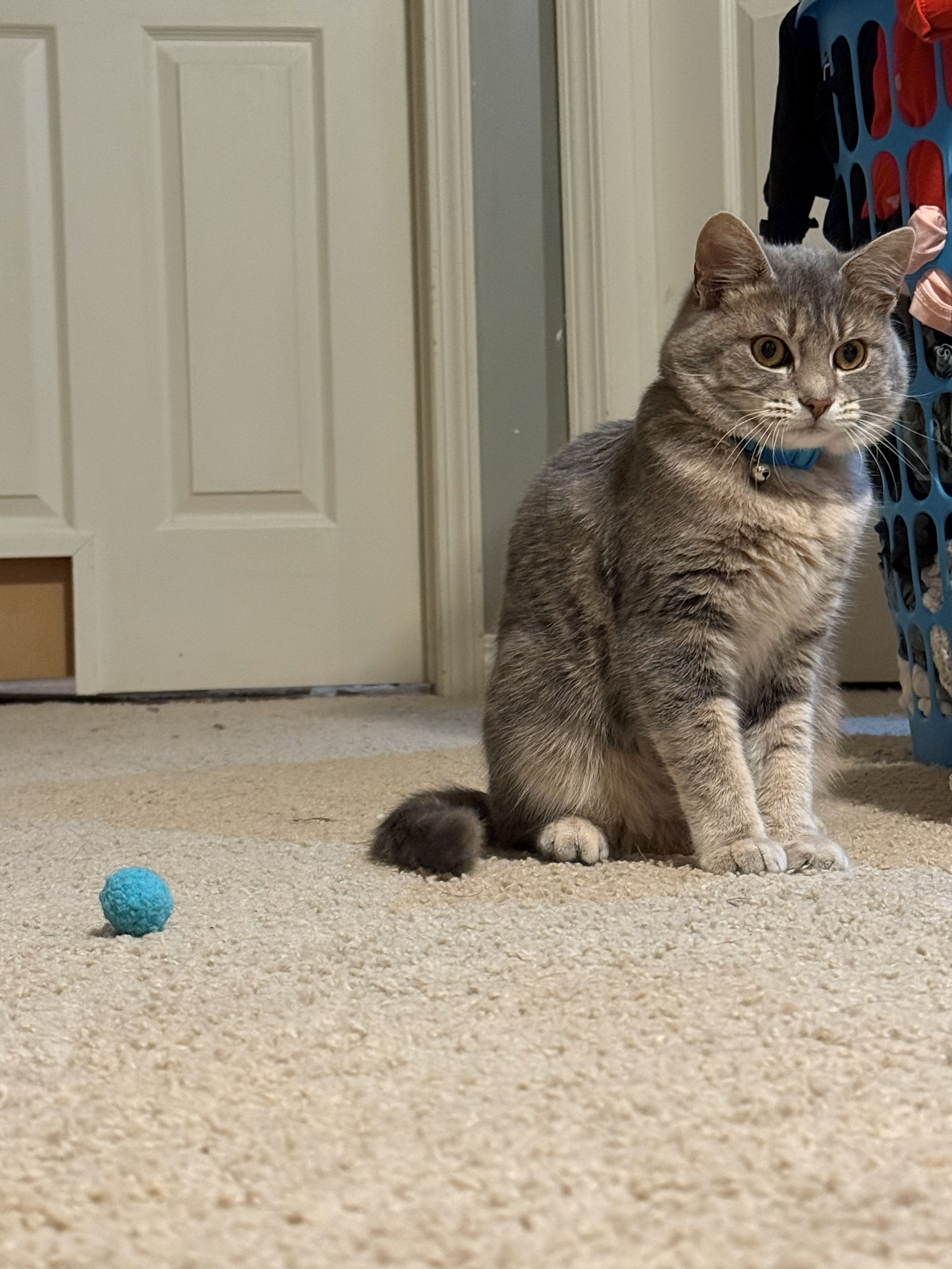 This sweet girl likes to take things at a slow and quiet pace, but with some space and patience, we have really got to know this cutie’s personality. She loves to play both on her own and with people. She’s not a fan of being picked up/held, but loves accepting pets and chin scratches in her safe space (currently a cat tree cubby). With time, I can see her being more open to affection (she has even snuck into bed with me a few times after I have fallen asleep.)