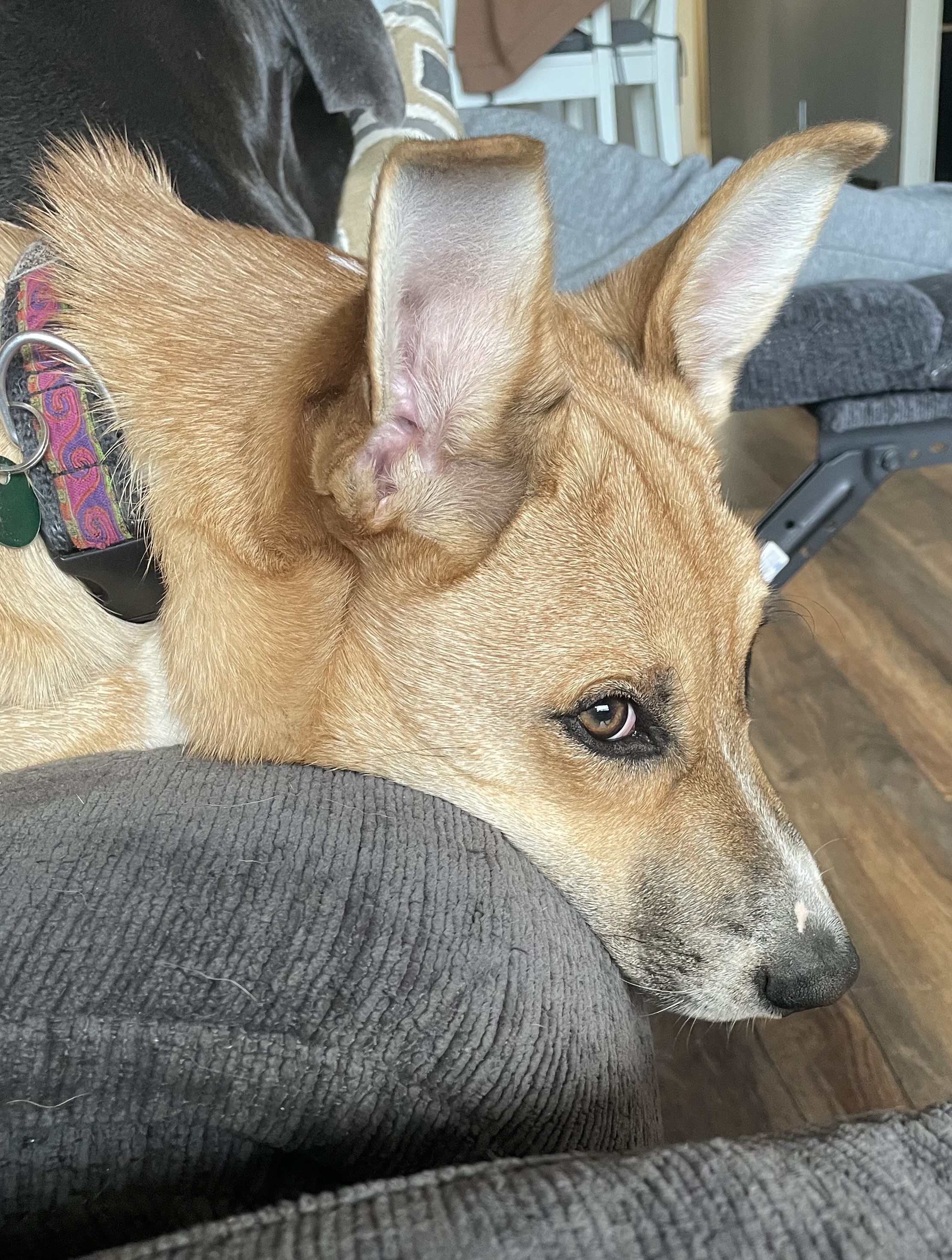 He has learned sit, wait and is working on leave it; he’s housetrained and he sleeps quietly in his crate at night. He loves playing in the backyard with the resident dog in his foster home. They can go for hours if you let them!  He loves his walks, and a hike is even better because the sniffs out there are irresistible!  He’s always up for a brain game too. After playtime Basil is more than happy to snuggle up beside you on the couch for a nap.
