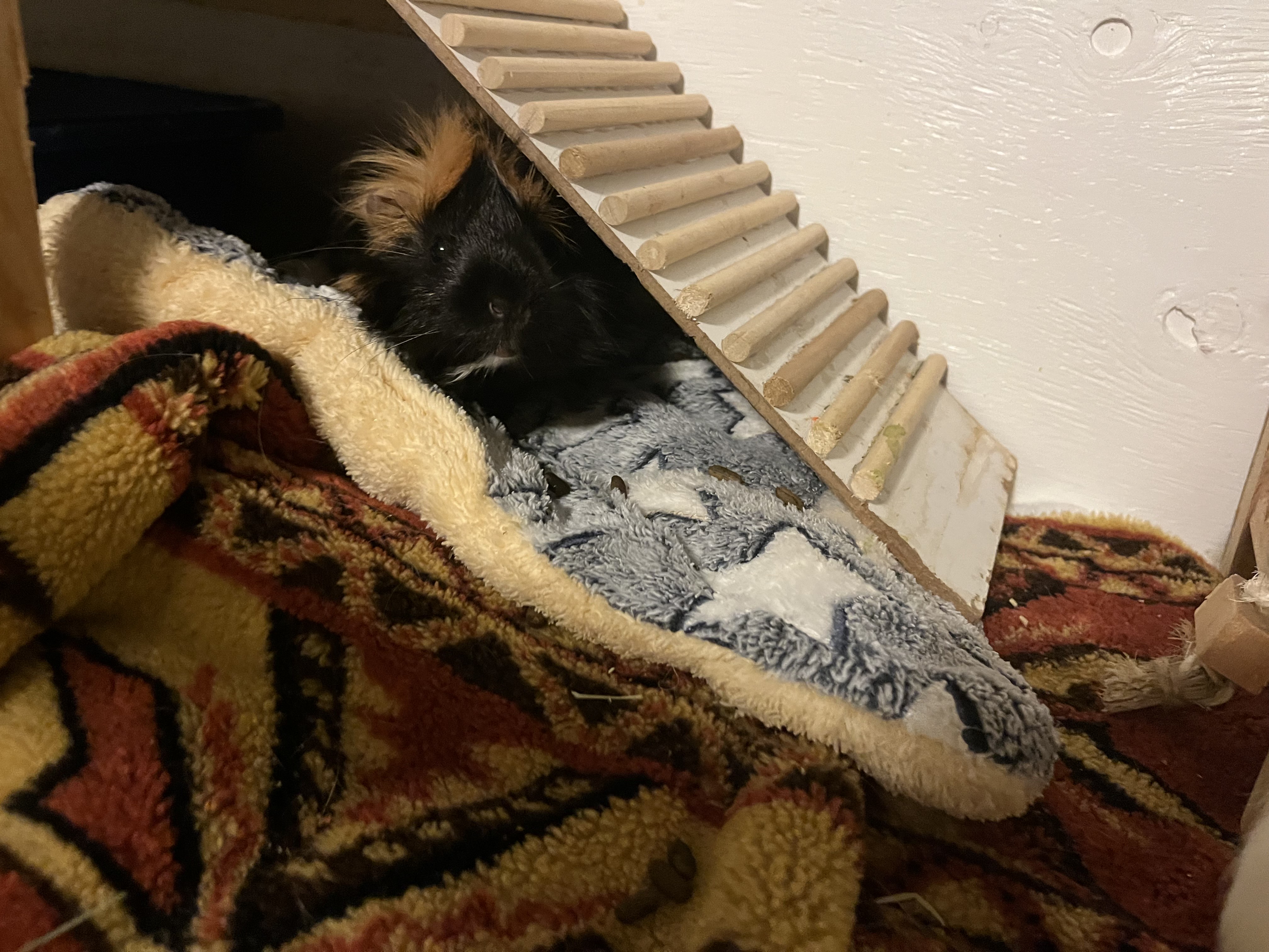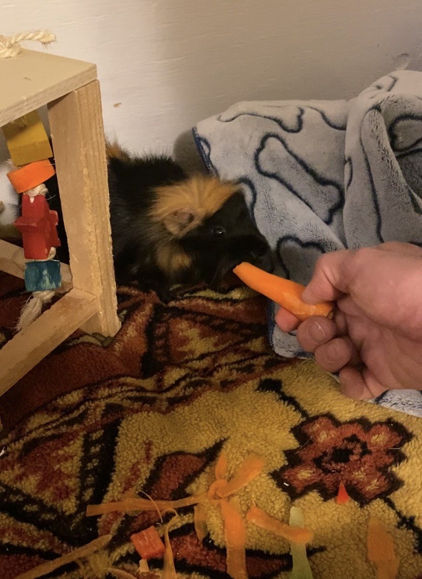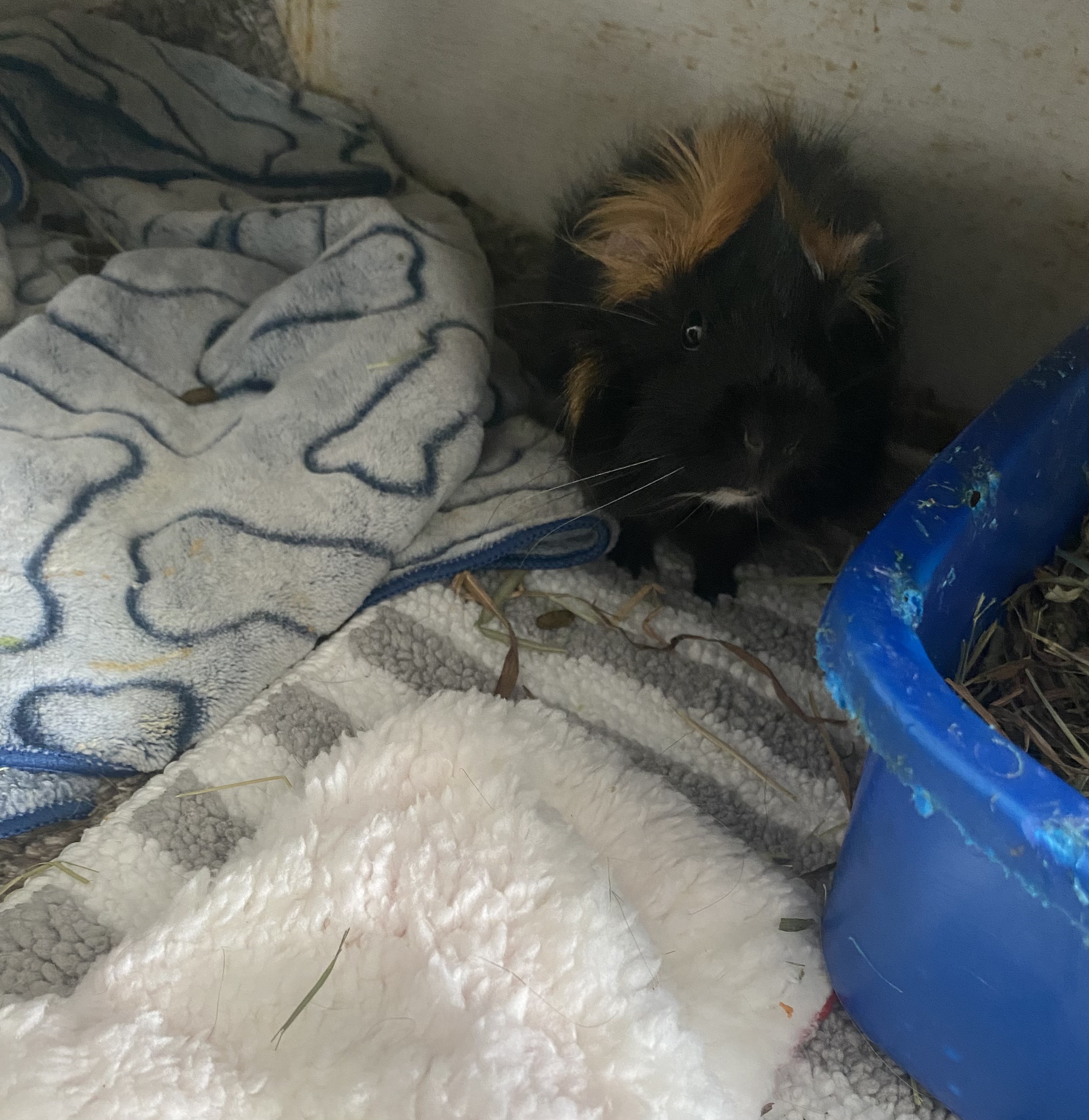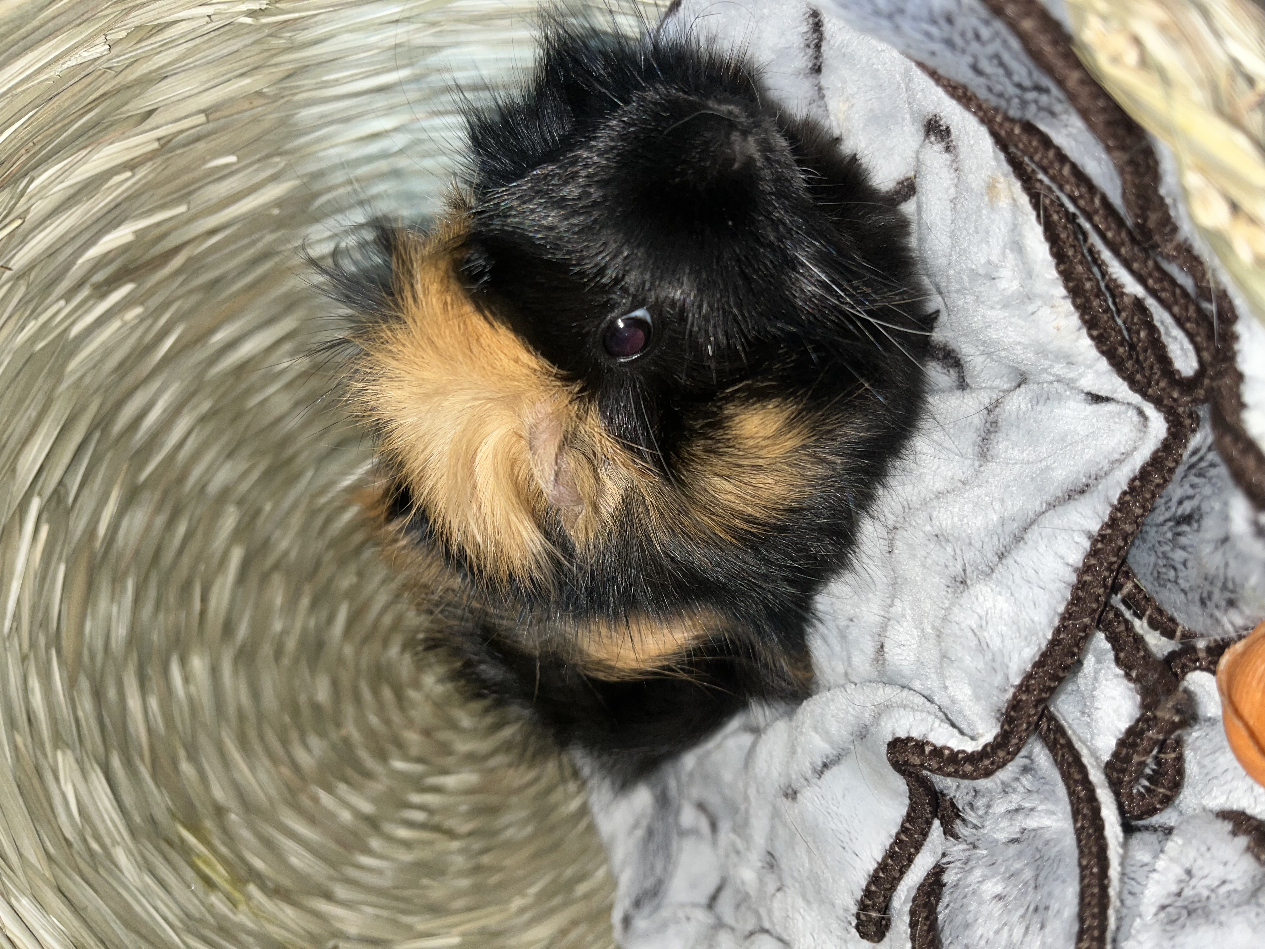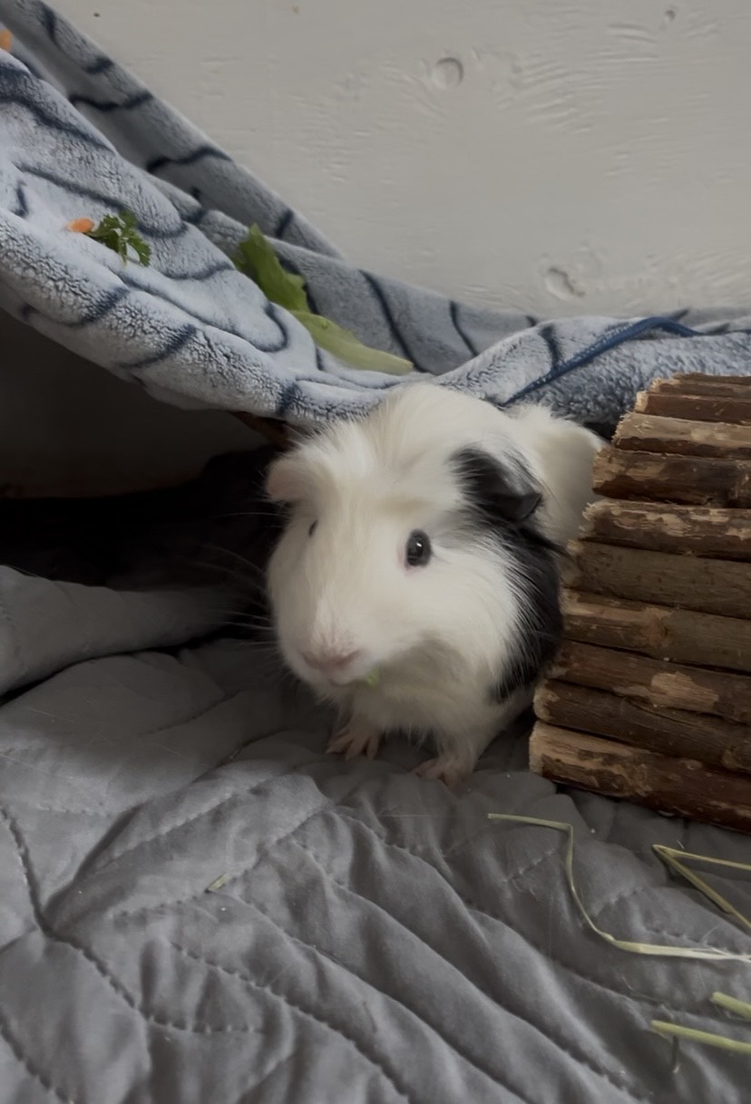 Oreo is the brave, bold leader of the duo — quite possibly the boldest guinea pig we’ve ever fostered. She actively seeks out food and attention, and is happy to tolerate pets if it means yummy veggies are involved. Oreo insists on being part of everything: while most guinea pigs hide during a quick cage clean, she’s right there “helping,” supervising the hay quality, inspecting fresh food, and investigating new blankets as they’re placed. She’s confident, curious, and endlessly entertaining.