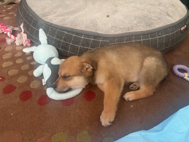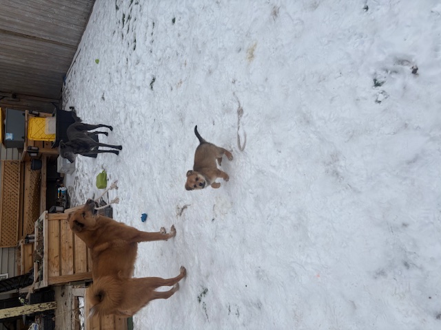 She loves outside. She could care less about the snow. She gets out there and gets the zoomies and loves to chase her foster brothers. After all that play, it is nap time. She likes to curl up close and have a good sleep. She loves to be around her people but is also good at occupying herself. She goes in her crate when she’s home alone.