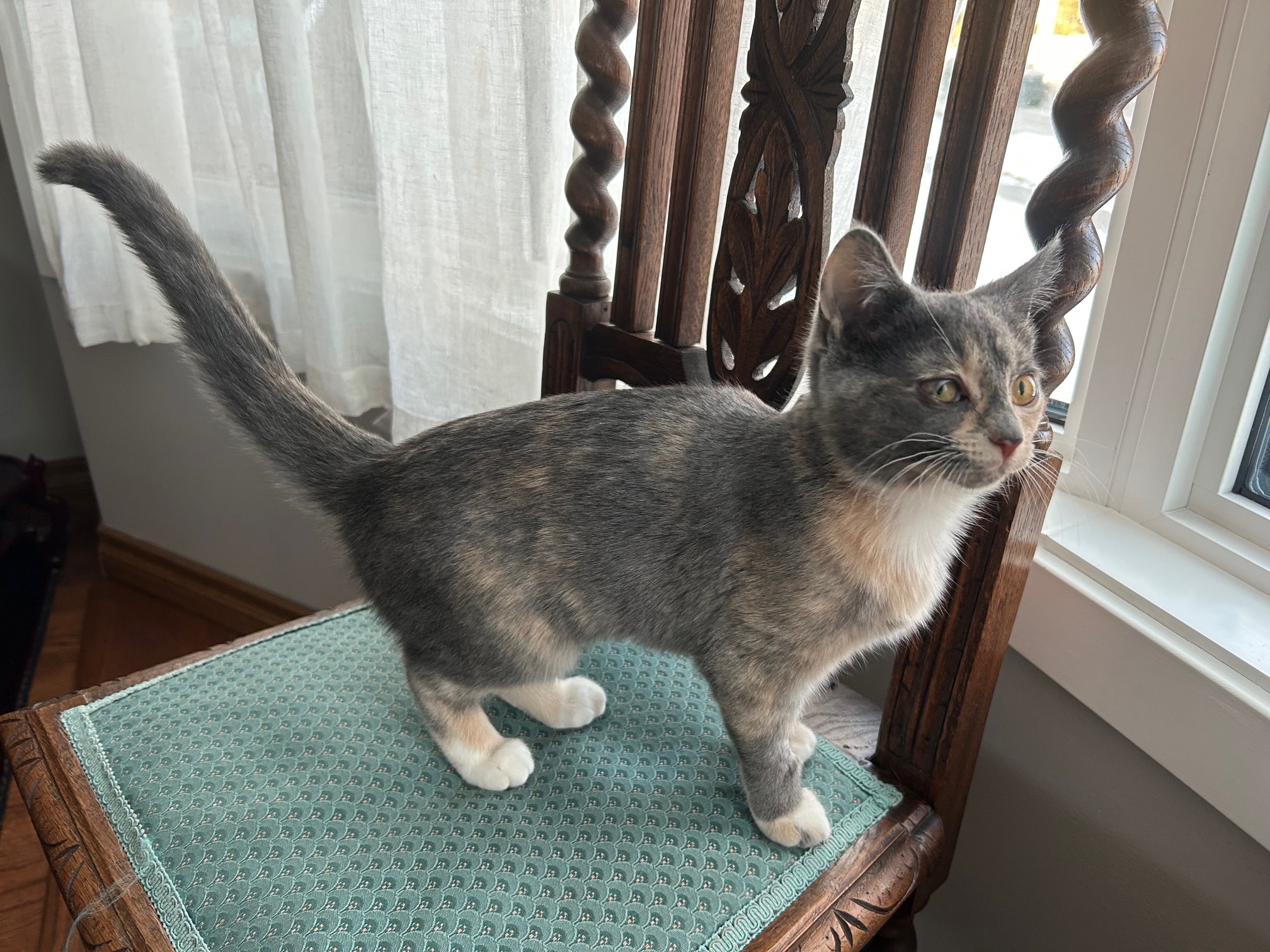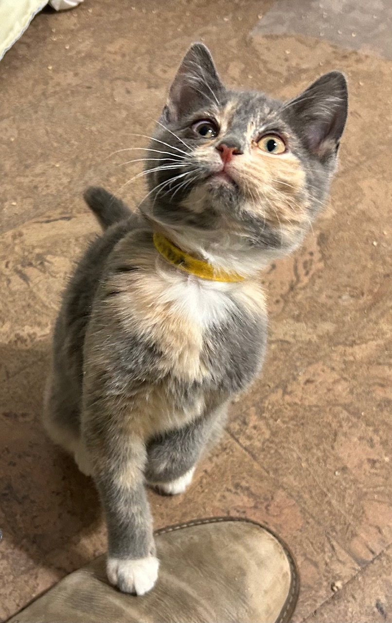 We love playing together until we’re exhausted.  When we run out of steam, we curl up together in our foster parent’s lap for a recharge nap.  I’m the assertive one, I know what I want and I make sure I get it.  I’ll steal toys from my sisters or the adult cats and I love wrestling.  I really like hiding in the cat tunnel too and jumping out when another cat comes by.  I have a wide range of sounds and I am constantly chatting with my humans.  Like my sisters, I have a loud purr and it’s easy to get me started.