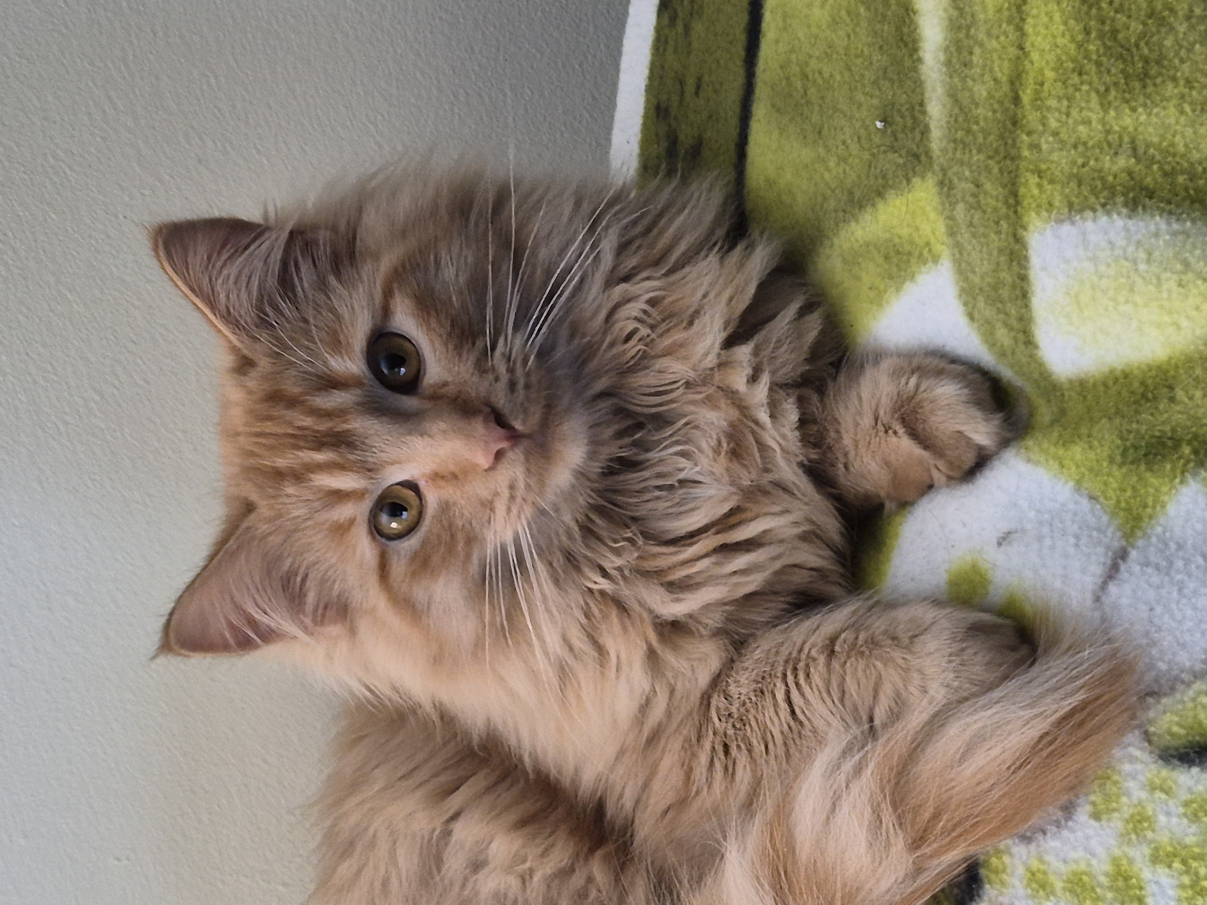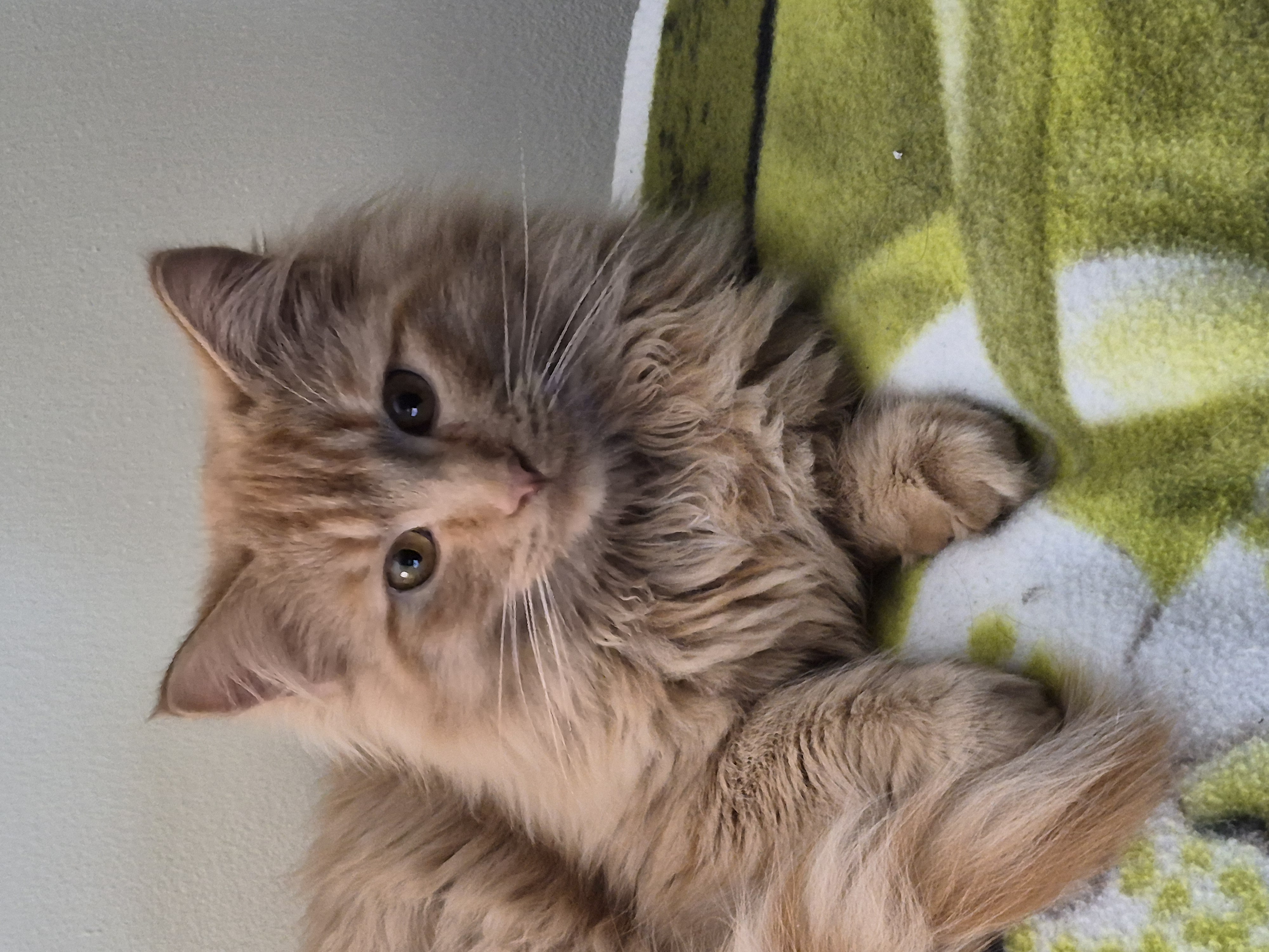 Shy at first, but once I’ve warmed up, you’ll find me wrapped around you! My squeaker voice will let you know when I am hungry (always starving!). Sometimes I will even push the bowl for you to see! I’m learning to play (that darn red dot!) and those fuzzy catnip mice!! But… we have to be careful with the springs… with my medium long, beautiful orange fur, I like to try and give myself ringlets!