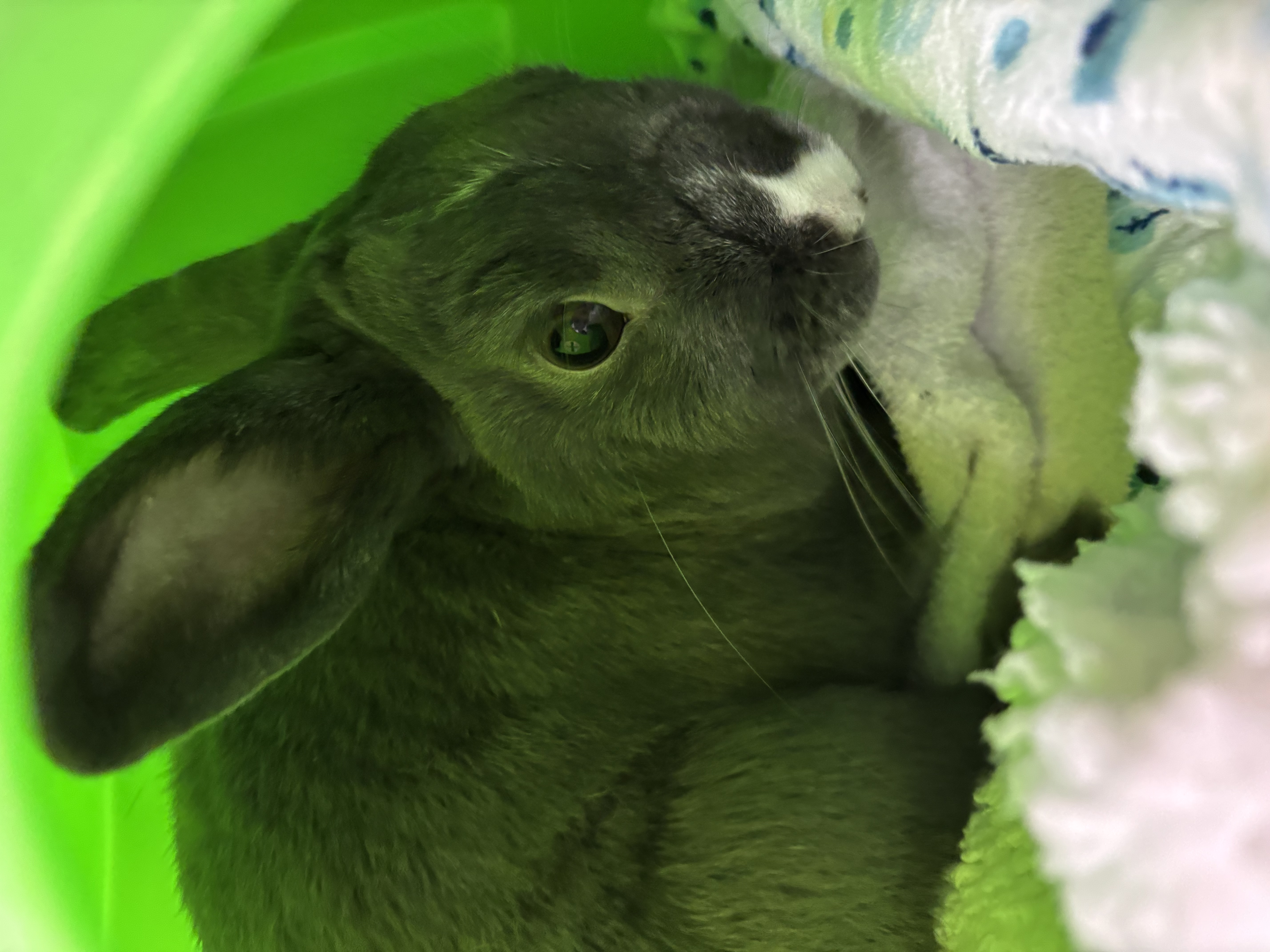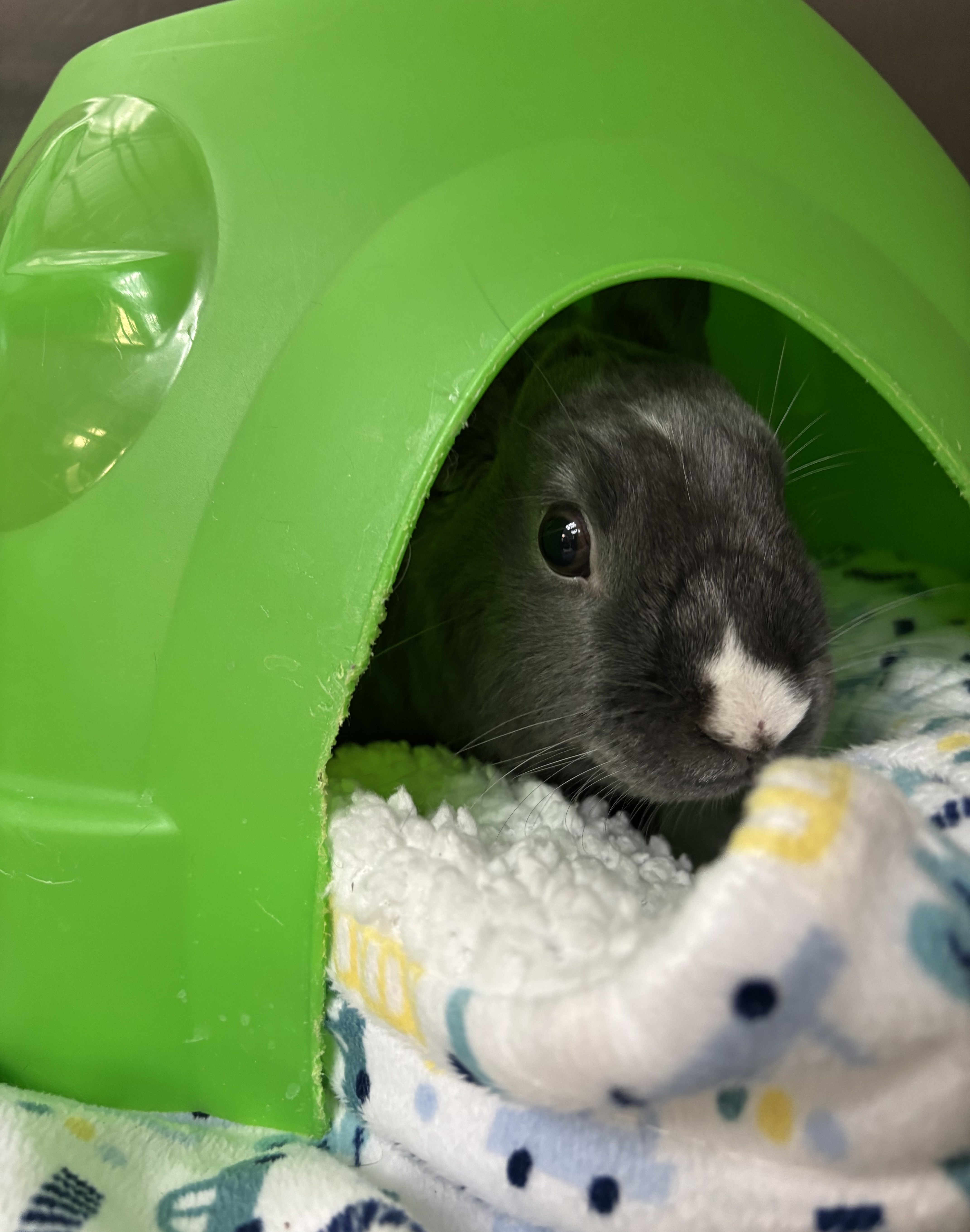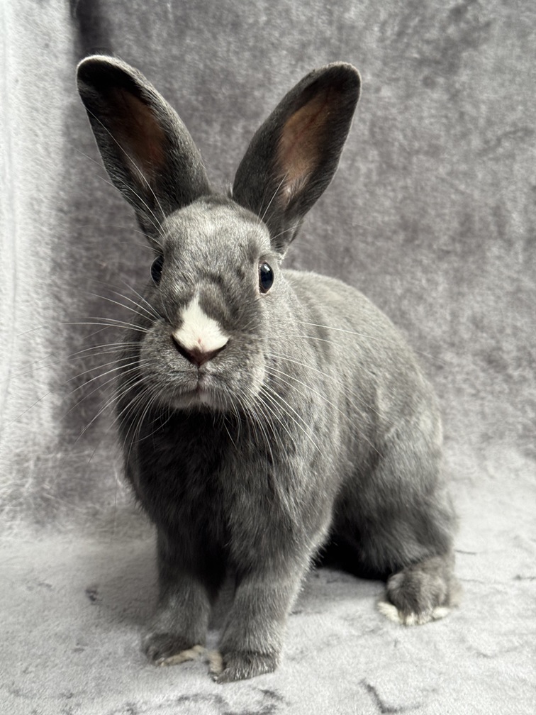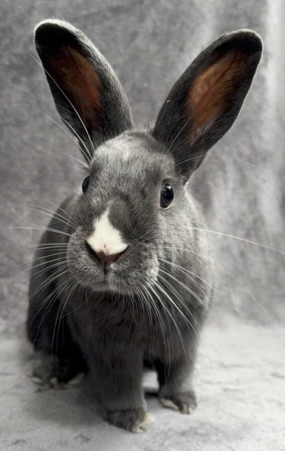 Melvin is a true hoptimist who treats the world like his personal playground. While he appreciates a slow introduction, once he settles into a spacious home, his true personality shines. He is incredibly curious and friendly, nudging you with a tiny nose that looks like it’s been dipped in powdered sugar.