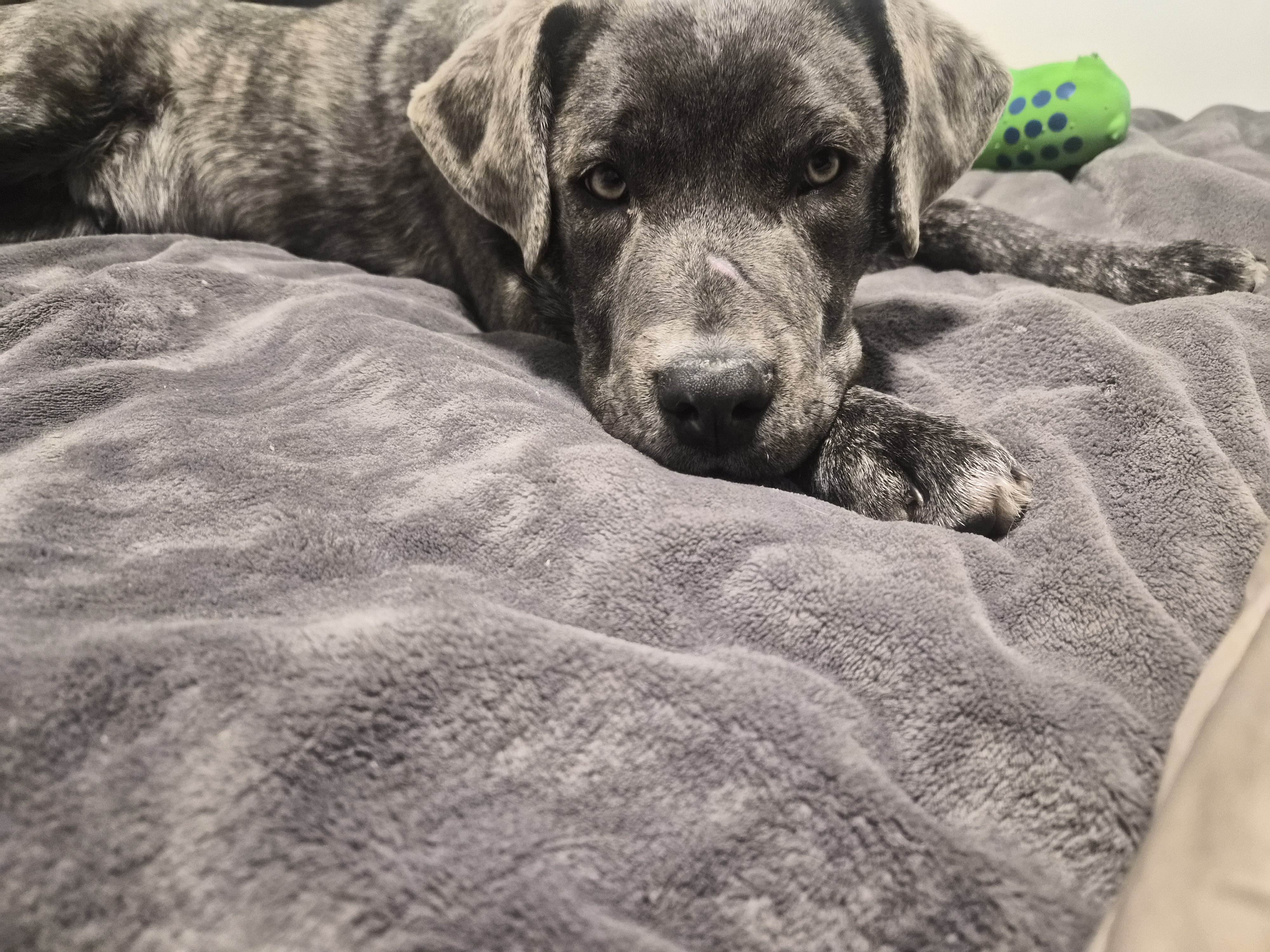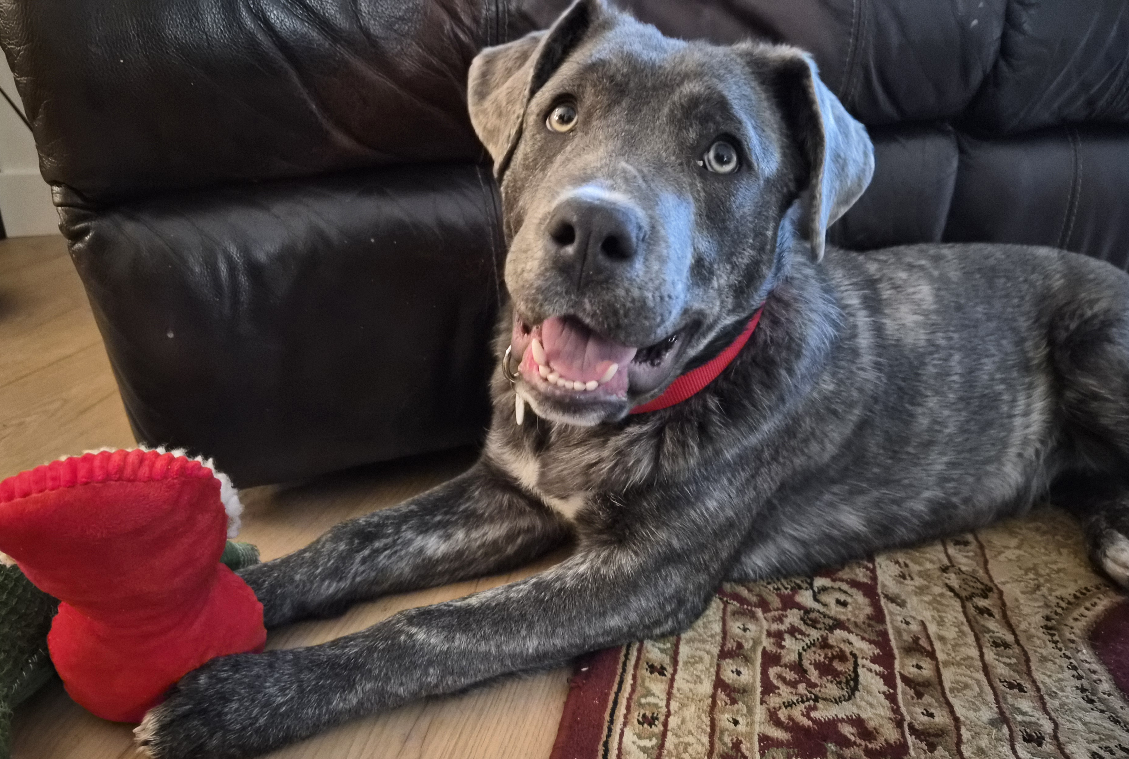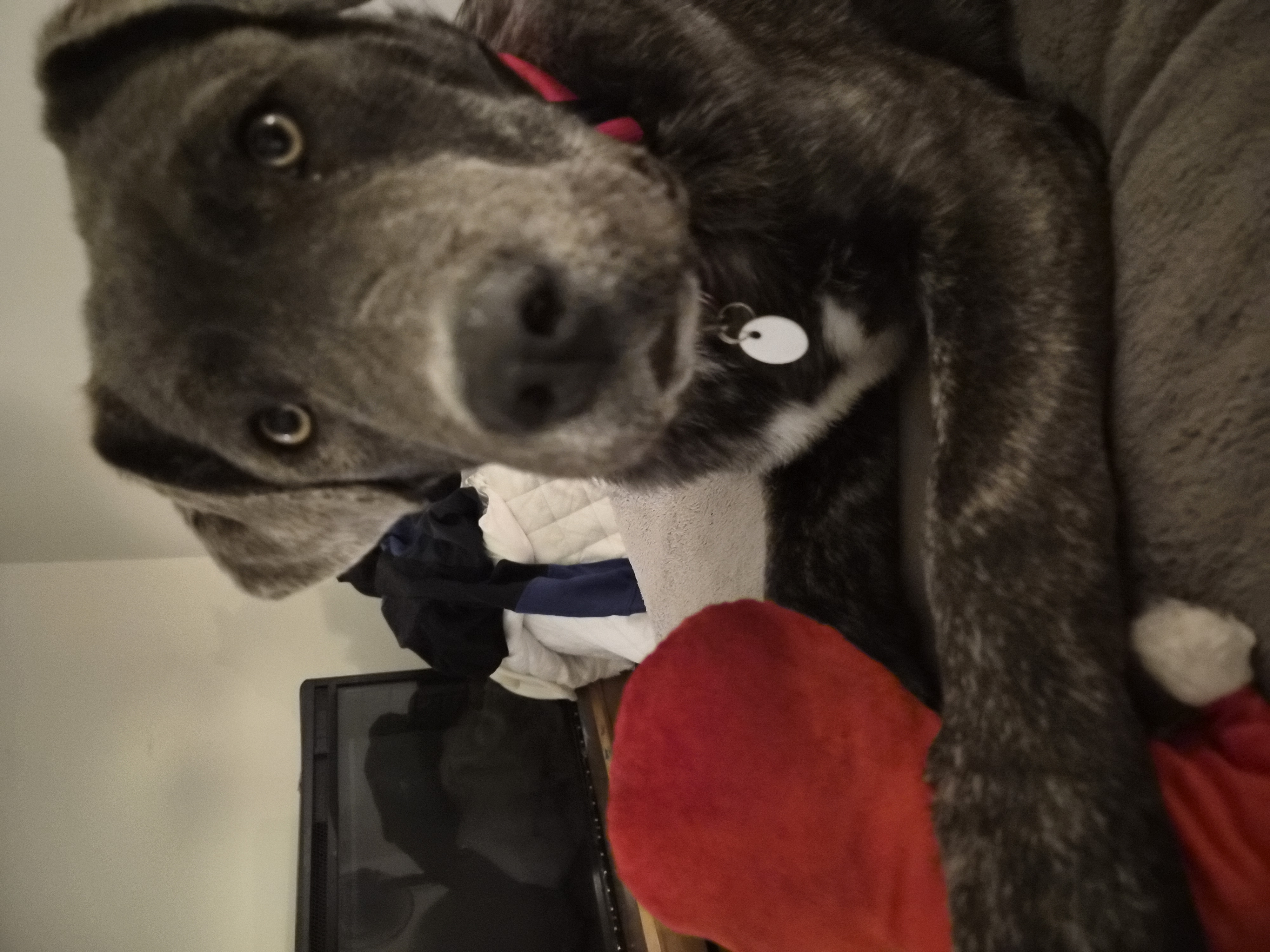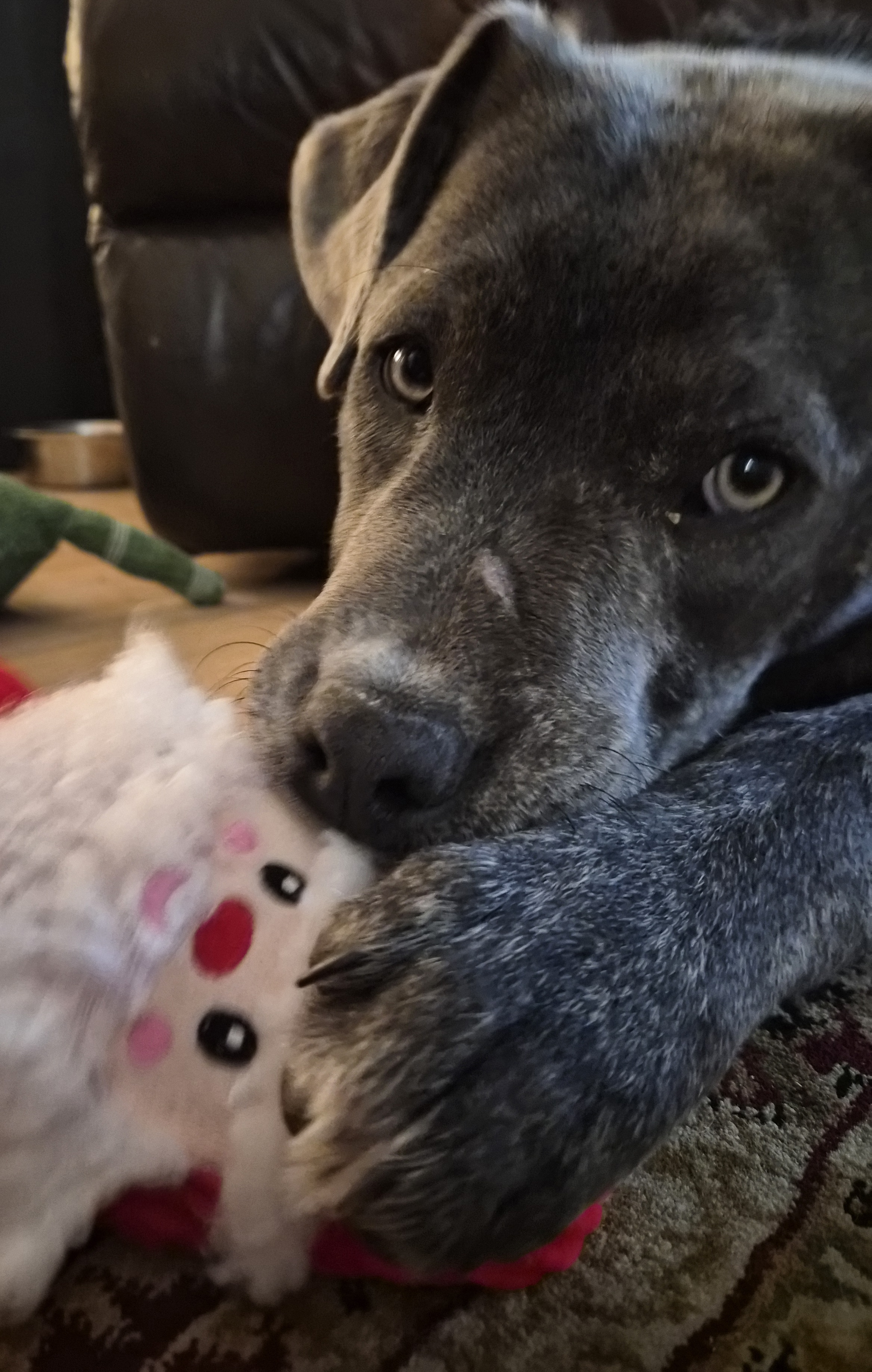 Steel loves a good game of fetch and proudly brings the ball back… though retrieving it from him requires quick reflexes or snack-based negotiations. Squeaky toys are another passion and will instantly activate his adorable head-tilt mode, side to side, like he’s processing very important information.