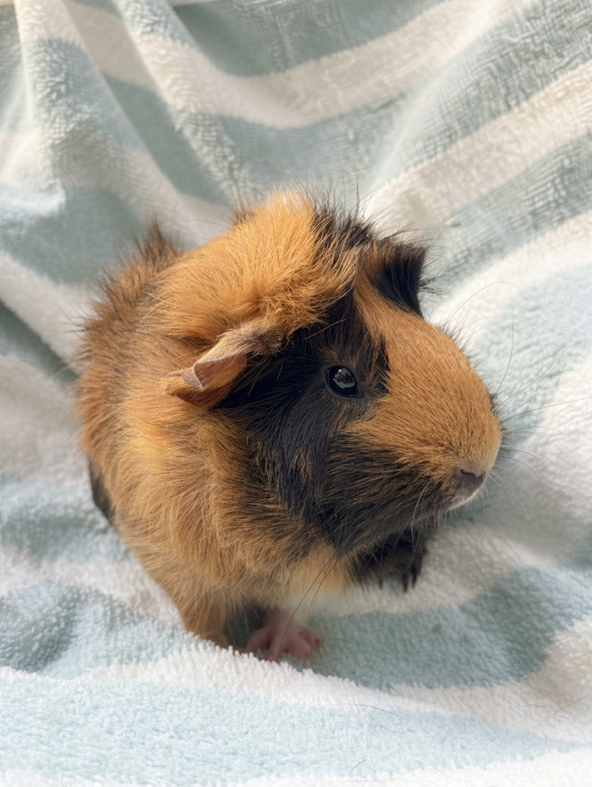 Lucky:“And my name is Lucky. I have a beautiful blend of black and brown patches. While I might not have the classic cookie colors, I’m a total lucky charm, and just as sweet! I may be a little shy at first, but with patience, love and attention, I warm up and show my true colors.”