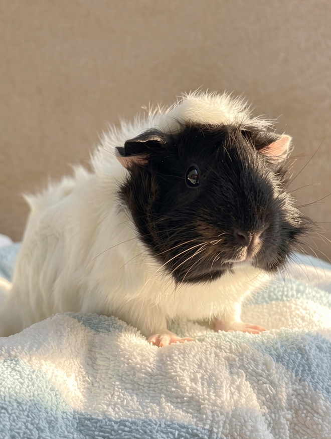 Oreo:“My name is Oreo. I have a cute black face, a matching black caboose, and a thick layer of creamy white filling everywhere else! After settling in, I’m curious and friendly, and love to be right in the middle of the action.”