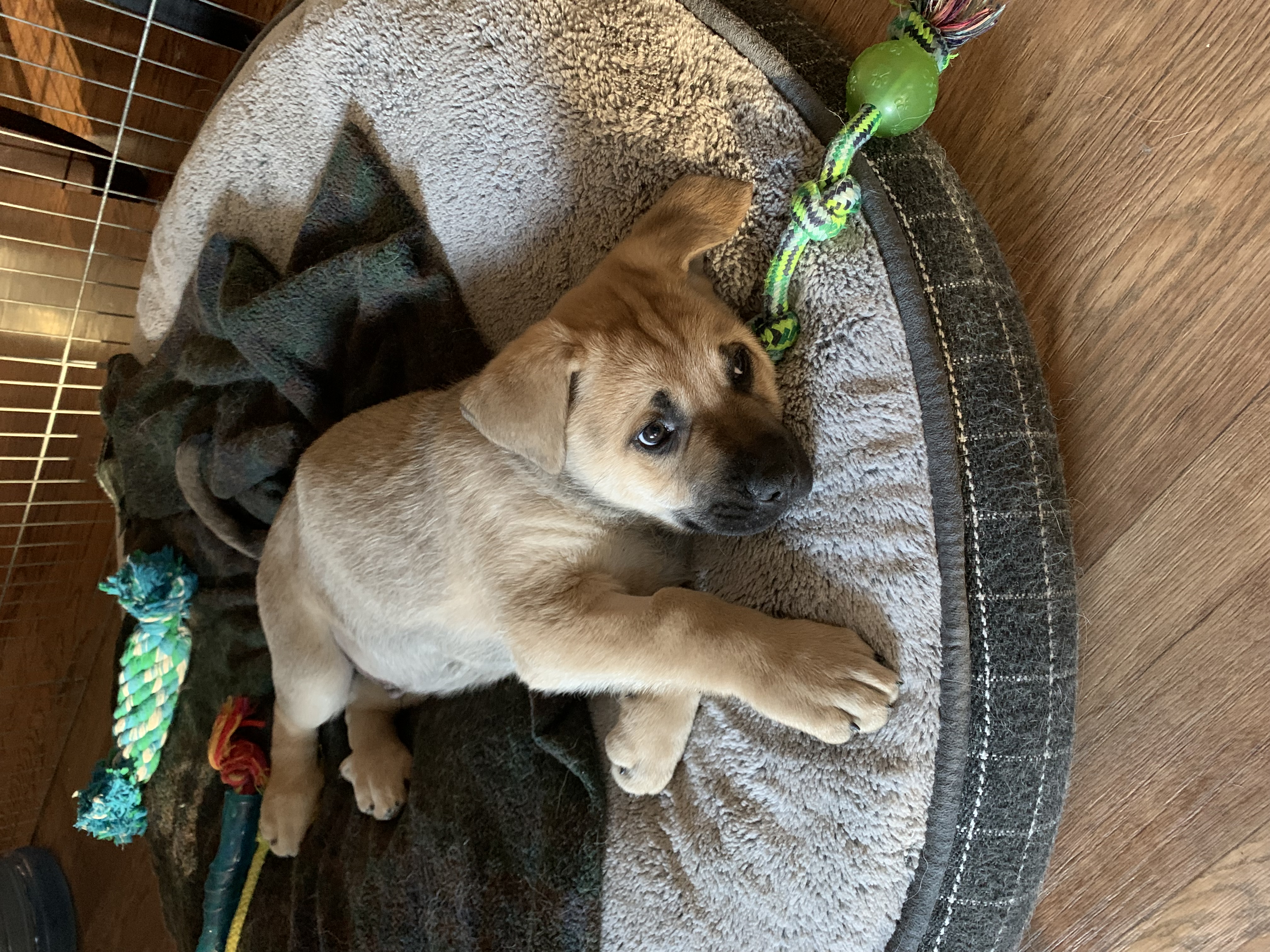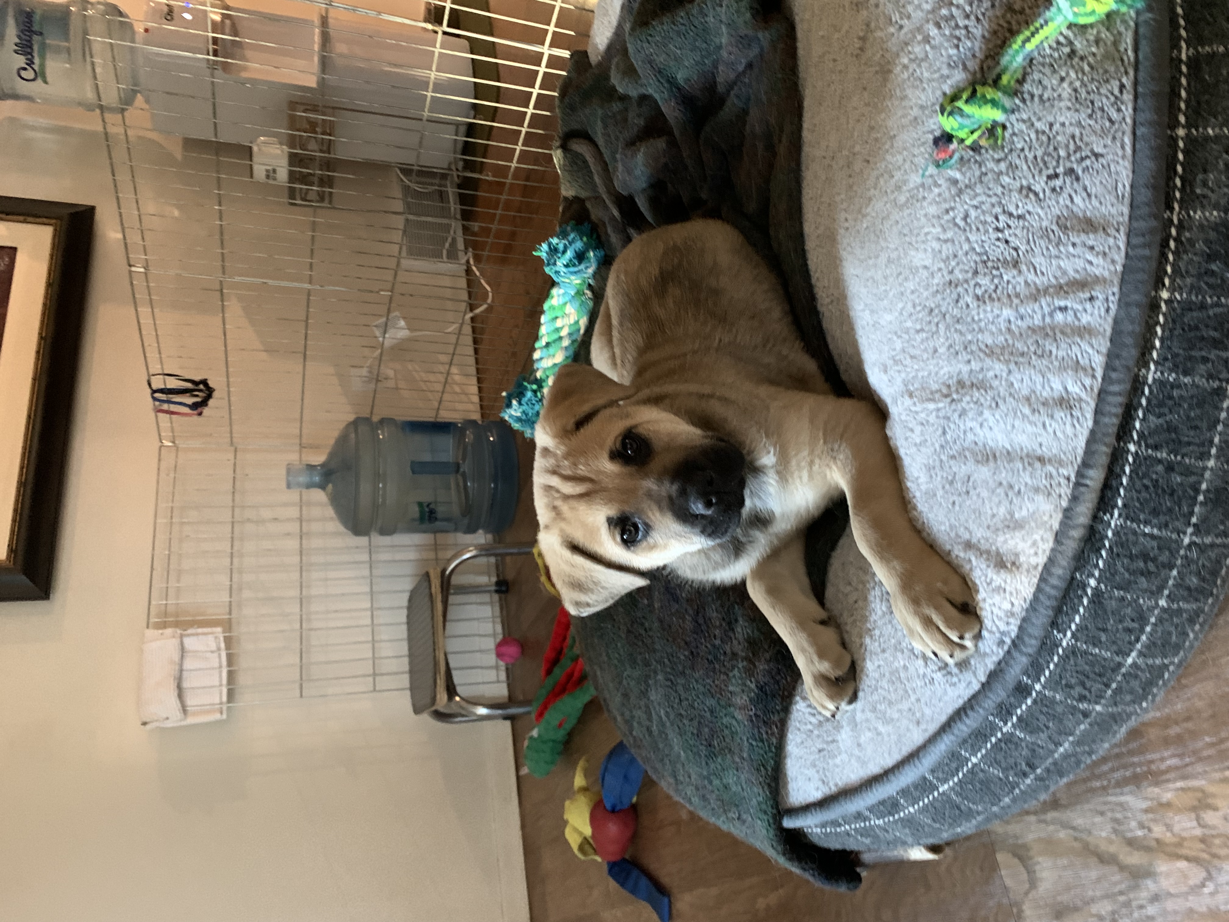 This clever boy is already showing how smart he is. He picks up new things quickly and is coming along wonderfully with his potty training. Outside is his preferred place to do his business, but sometimes uses the pee pad when we don’t get him out in time. With a consistent routine and lots of praise, he’ll be a pro in no time! He is also working on crate training and basic commands.
