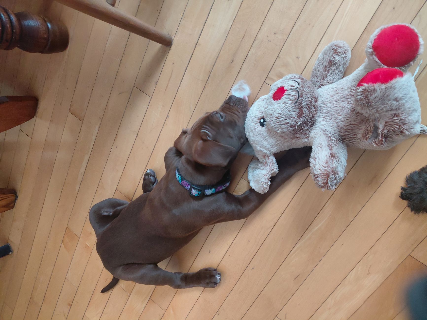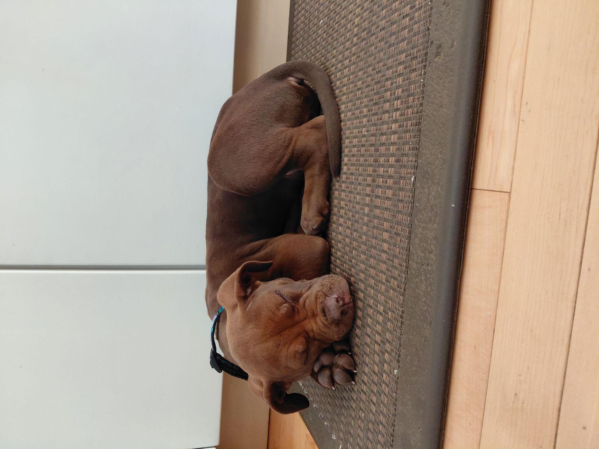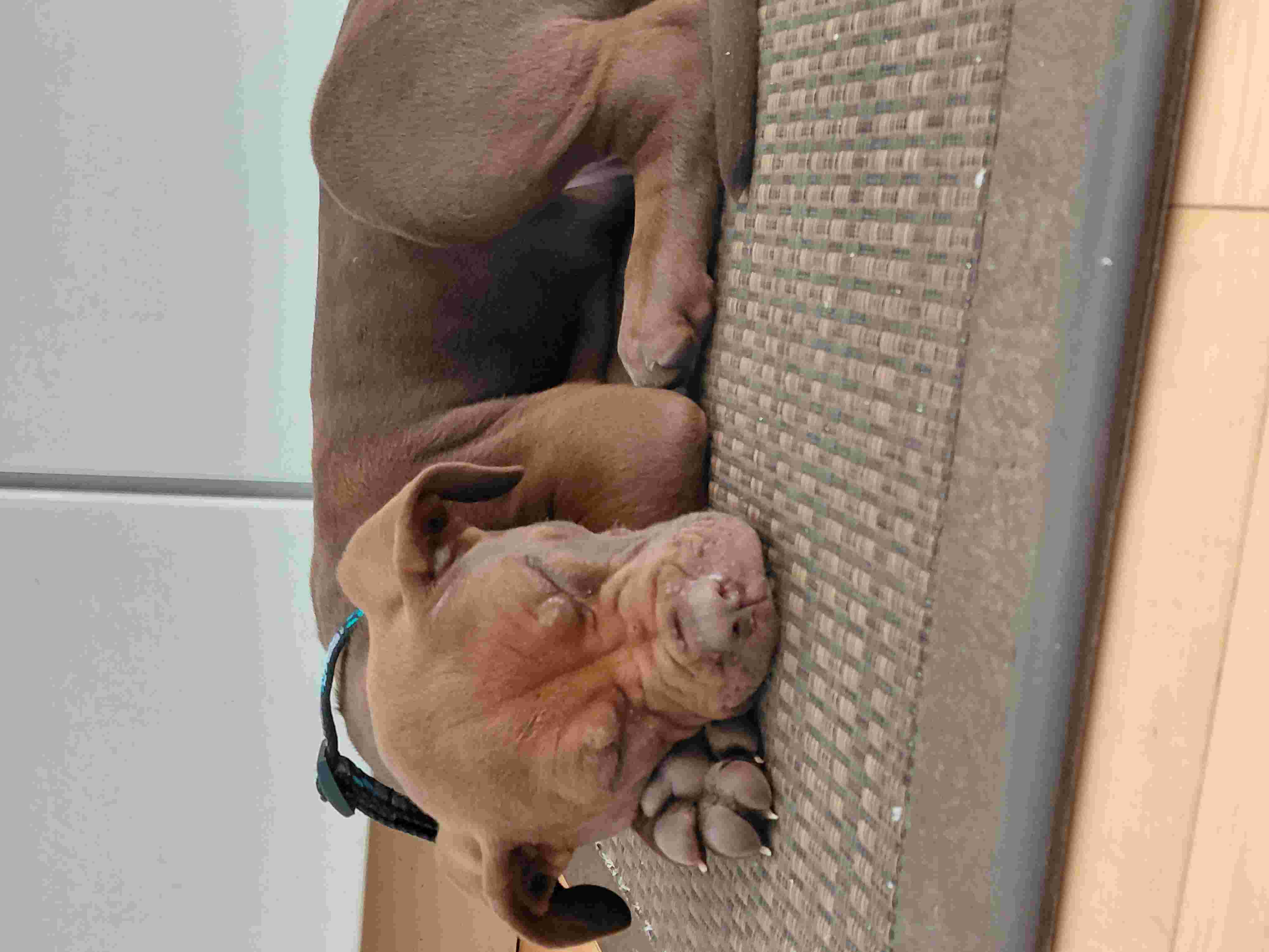 I am told that my house training is coming along well, and I am working hard on getting through the night without a pee break.  My foster brother is teaching me to play nicely with other dogs.  Tug-o-war is my favourite game, but wrestling might be a close second.  I can be noisy when I’m unhappy or looking for my brother to play with me.  So far, I don’t love snow or cold, but my foster mom says that lots of short-coat puppies are not snow lovers.  I’ve been socialized with lots of other humans and so far I haven’t met one I don’t like.  I’ll fall asleep on anyone’s knee.