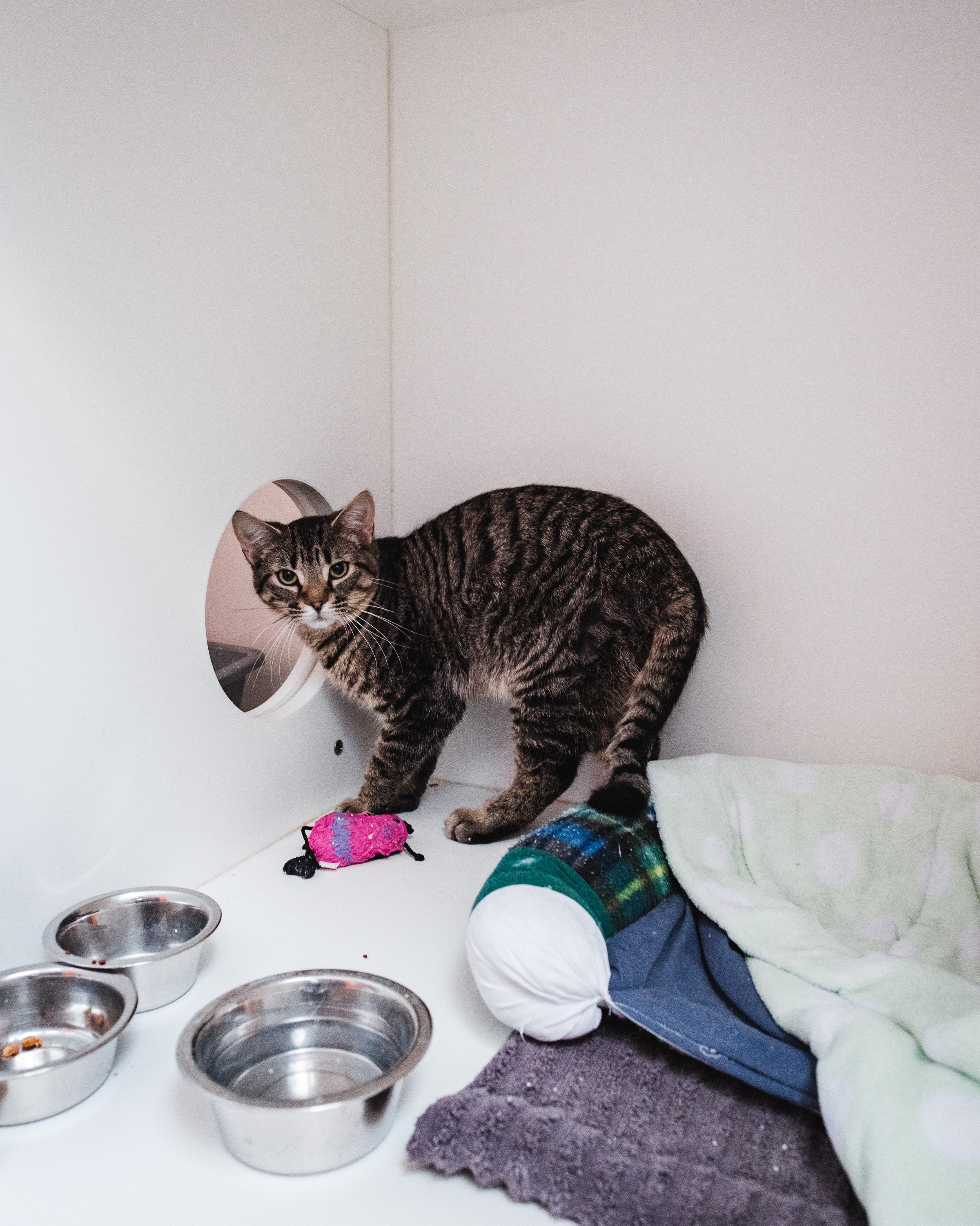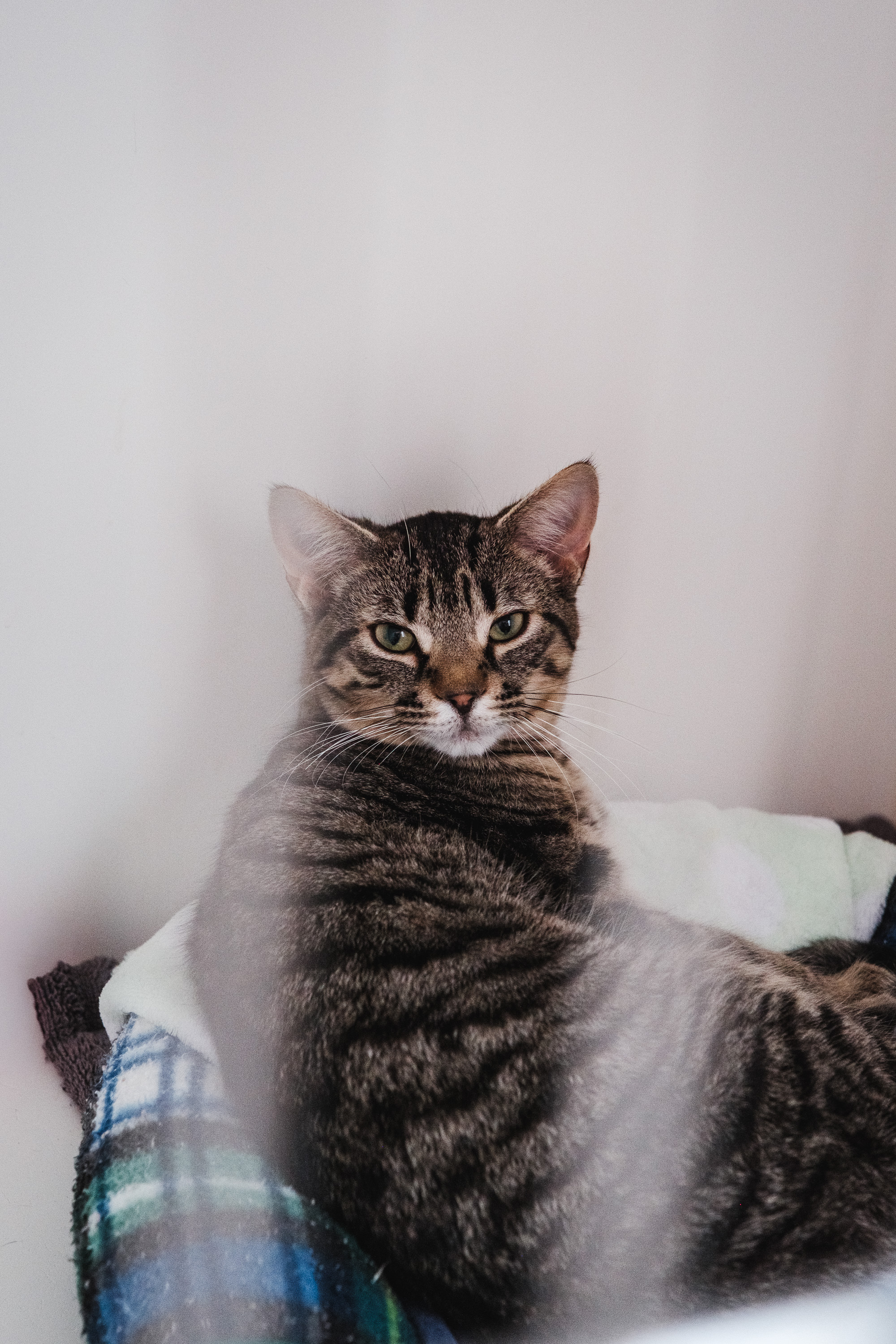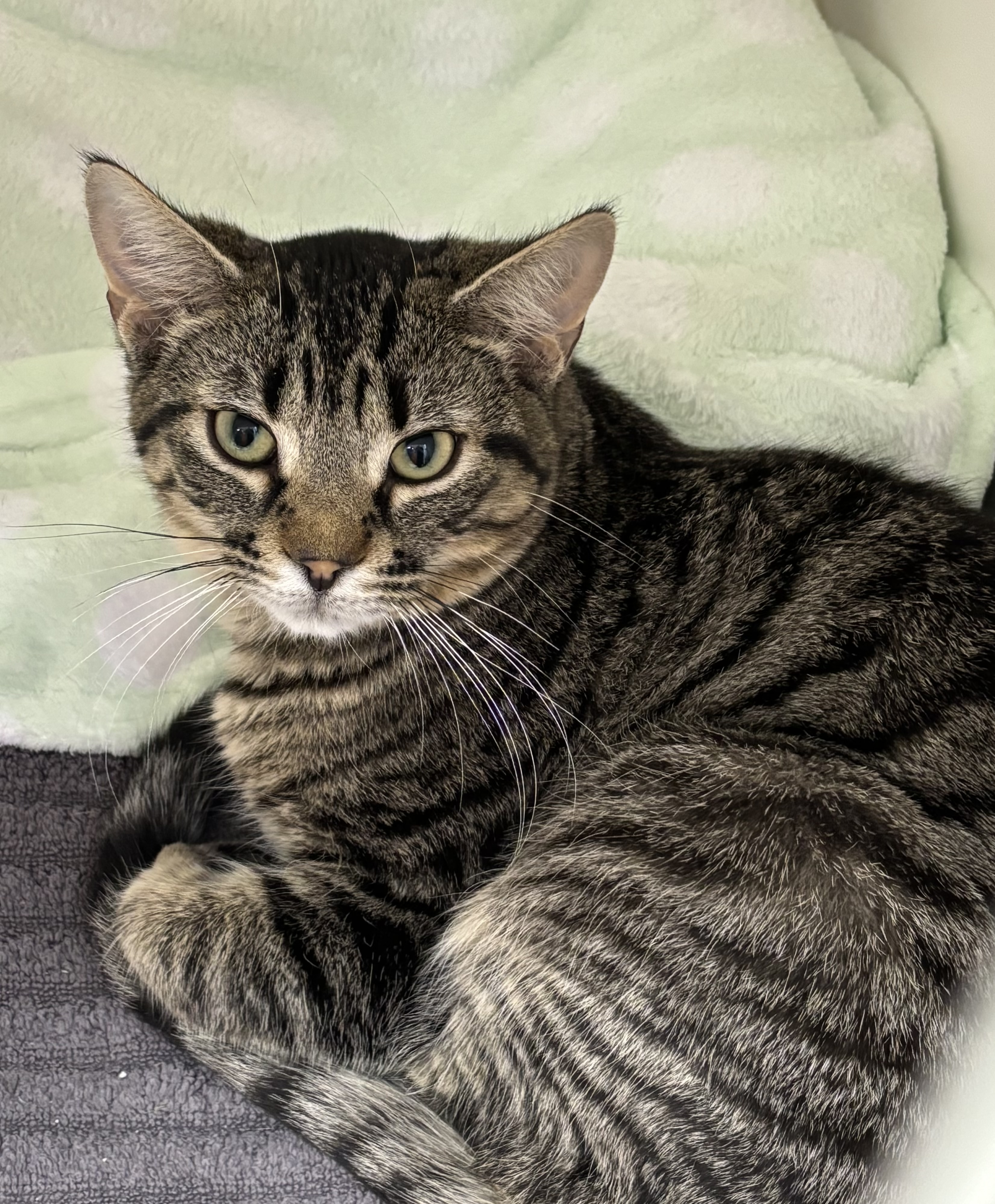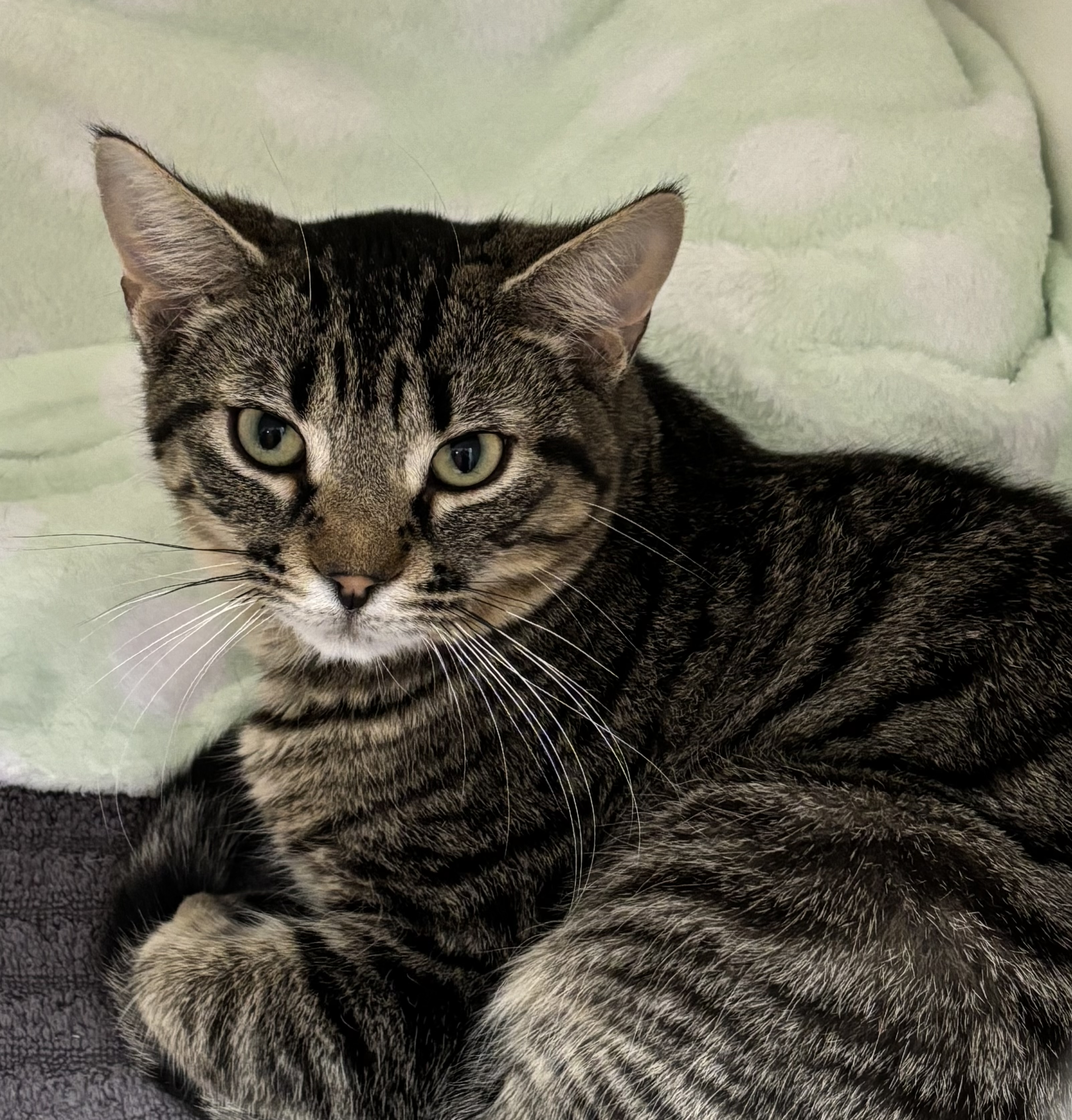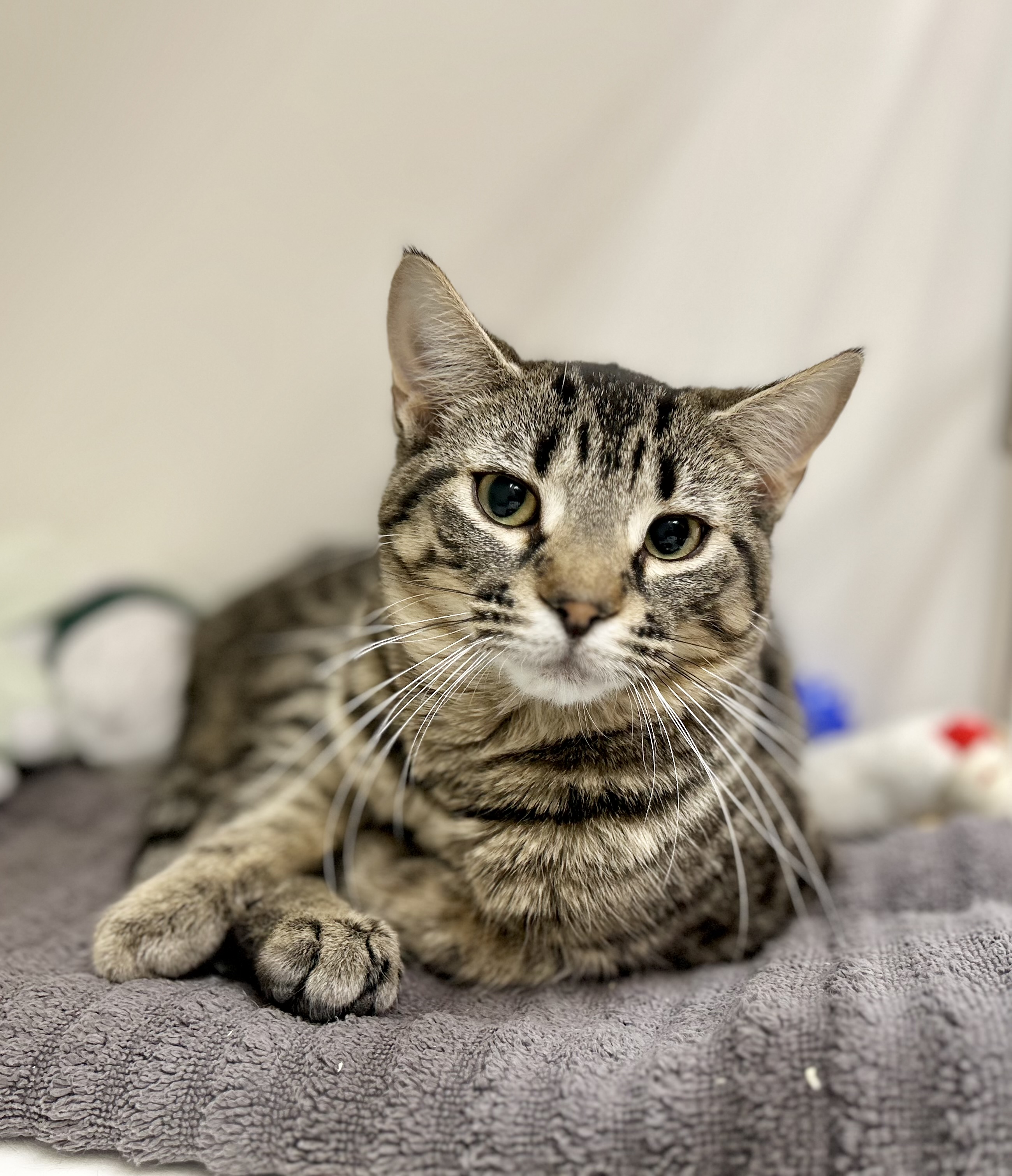 Buzzy is a quiet, soft-hearted tabby who prefers observing the world from a safe, cozy distance.