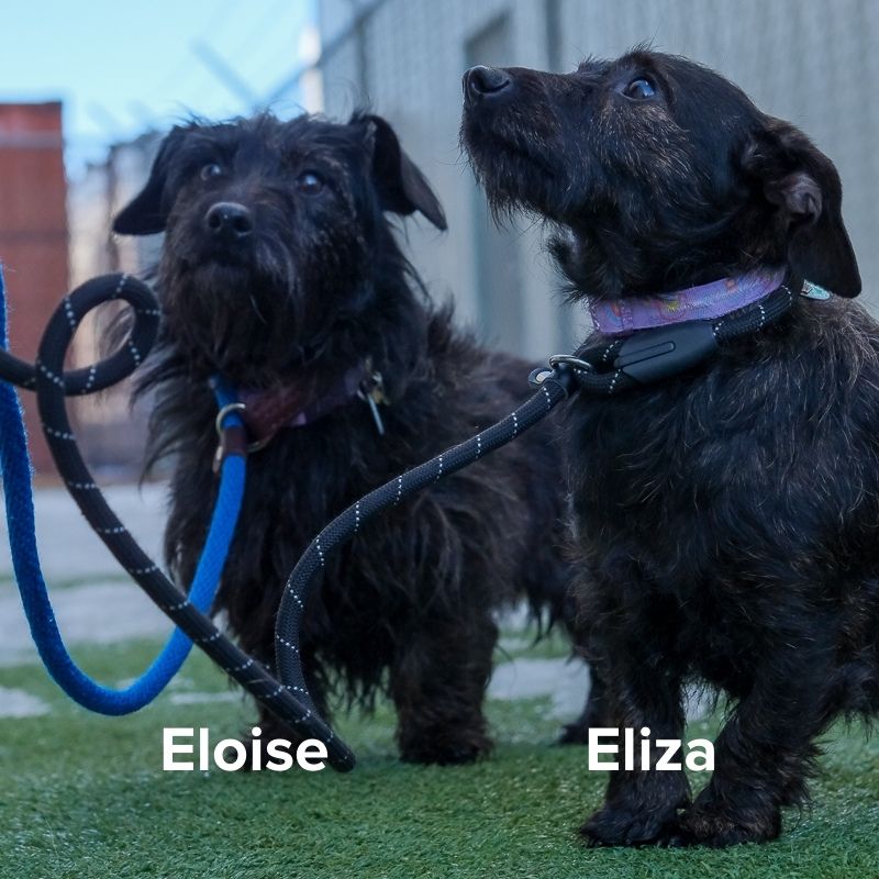 Because they can become uncomfortable when left alone for long periods, Eliza and Eloise would do best in a home where someone is around more often and where they can gradually build comfort with alone time. Providing plenty of enrichment, chew toys, and a secure area when unsupervised will help them succeed. Eloise can sometimes be a bit reactive toward other dogs, while Eliza is generally more easygoing, so thoughtful introductions and guidance will be helpful.
