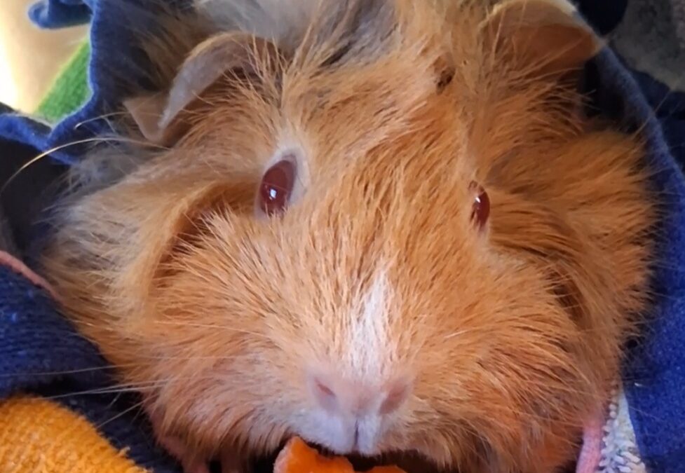 While he does tend to duck for cover when he sees movement, he’s curious and you’ll see him come out to explore if you sit near and give him a chance. He’s still not sure about cuddles, he’s already learning that they aren’t so bad and that scritches behind his ears are wonderful, he feels safest wrapped in a towel. With patience and kindness (and maybe a yummy veggie) you’ll win him over. Leafy greens are his favourite but Percy has not yet met a veggie that he doesn’t like and will remind you when it’s time to eat.
