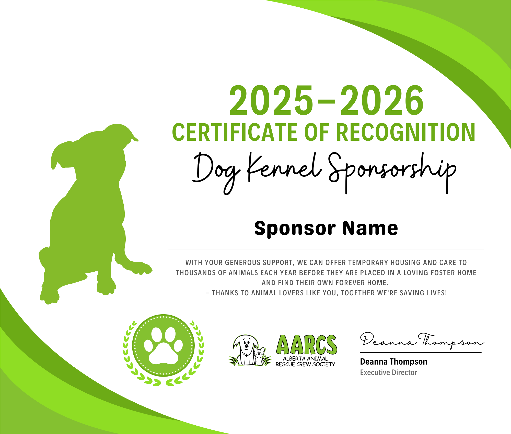 As a thank you for your support, an acknowledgement plaque will be placed on or near the kennel that you have sponsored and a Certificate of Recognition will be emailed to you.